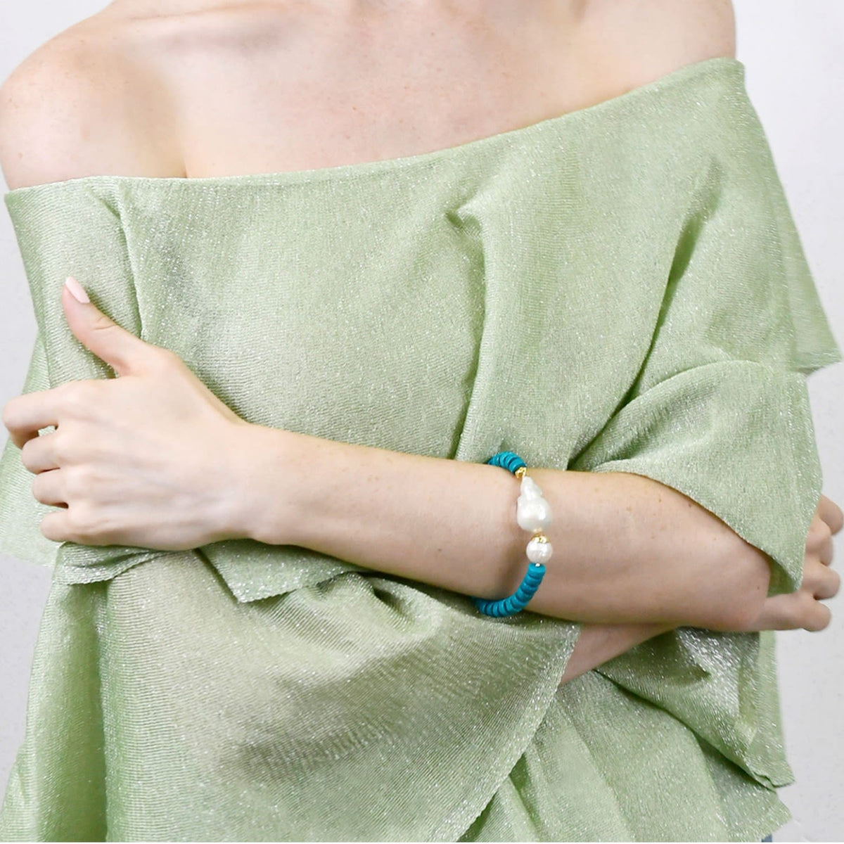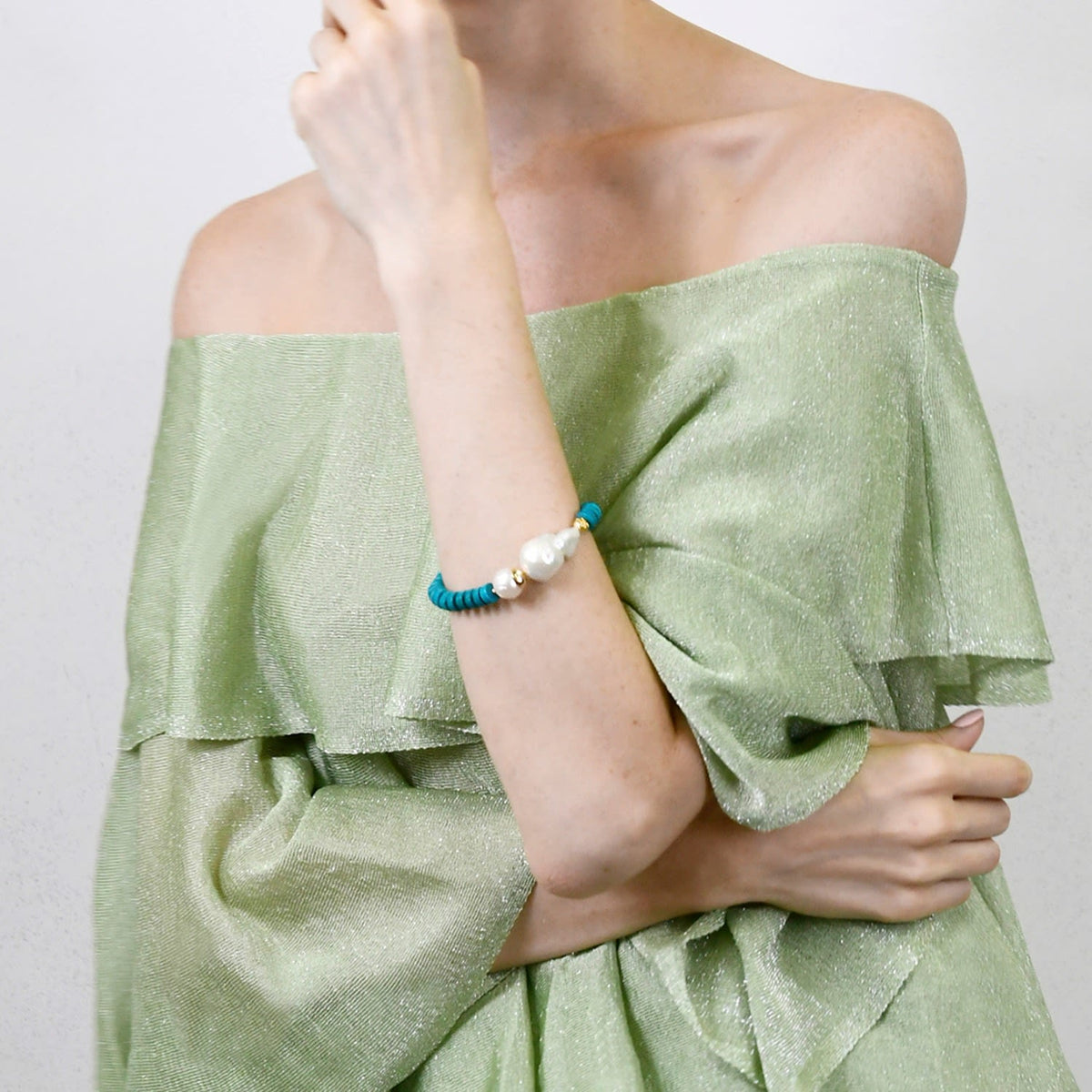 This bracelet is crafted from turquoise, baroque pearl, freshwater pearls, and Japan golden-plated brass findings.