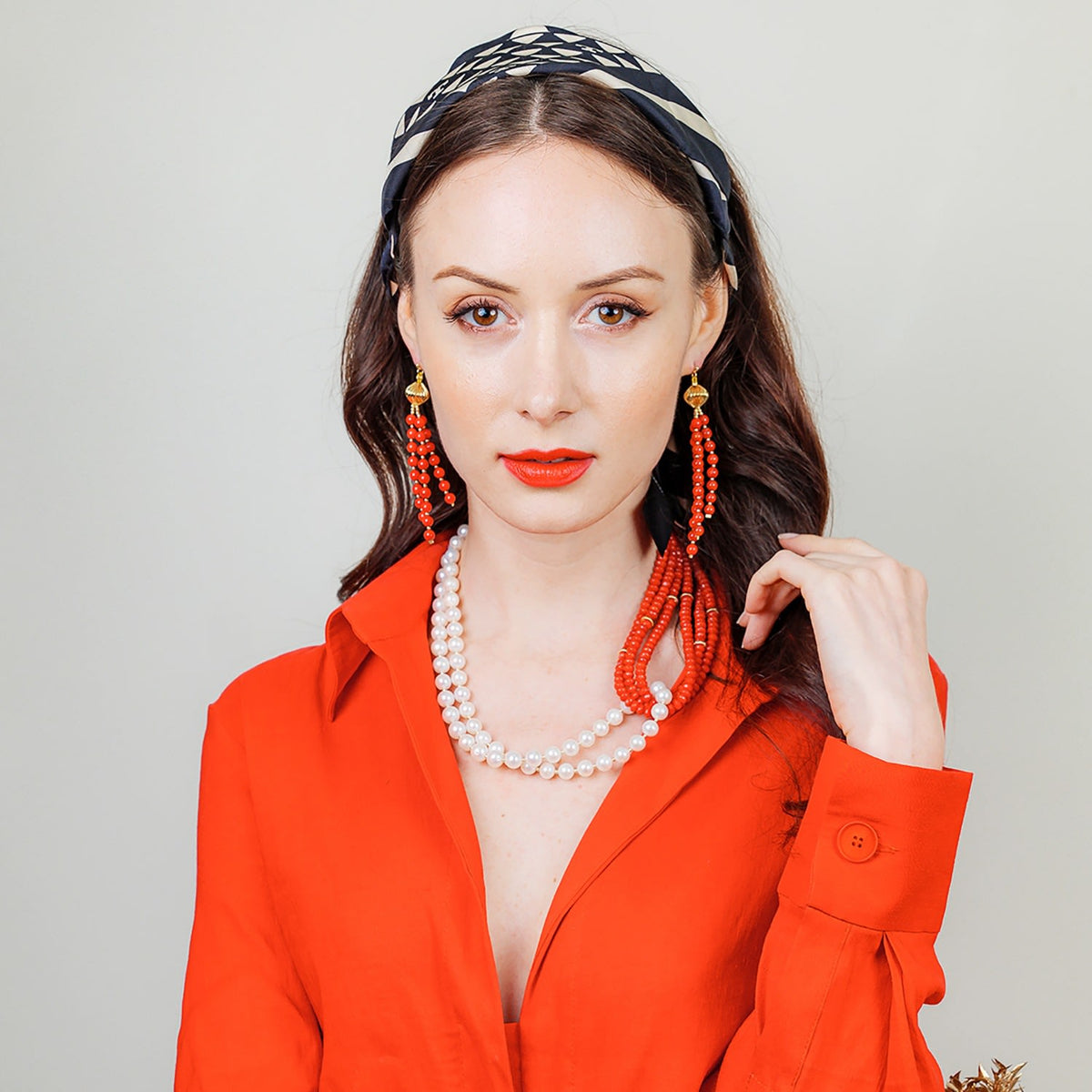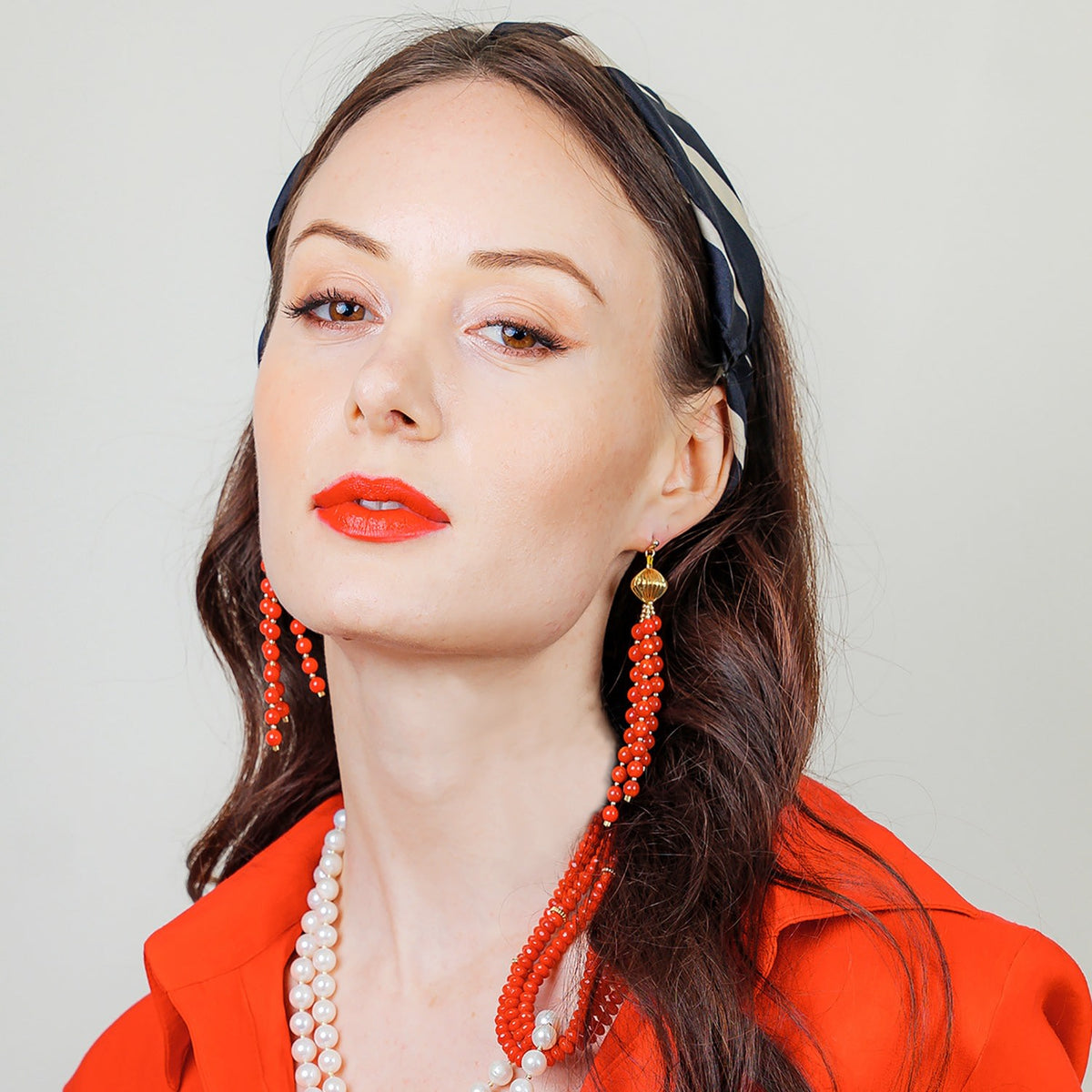 These Red Corals Tassels Earrings by Farra are beautiful and feminine. This pair of earrings is made of red corals with Japan golden-plated brass findings. They can be matched with a midi dress, blouse, or knitwear for any occasion.