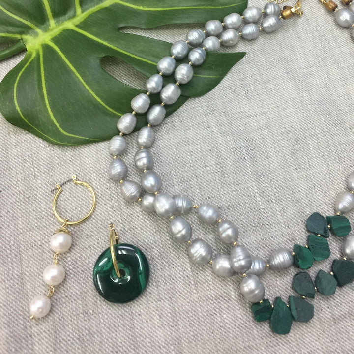 These pearl earrings are crafted from malachite with freshwater pearls and golden-plated brass findings. They are clip-on earrings.