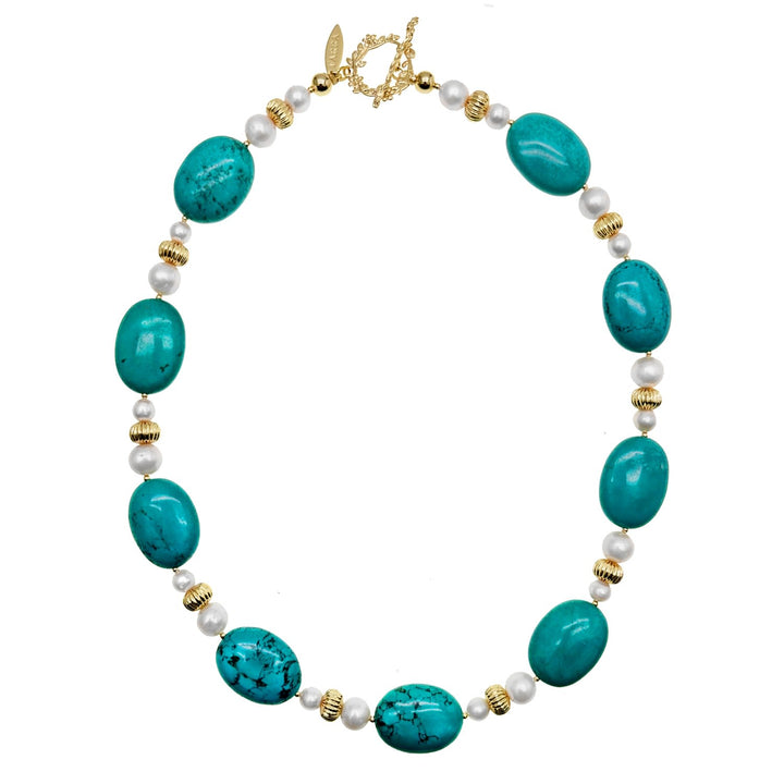 This chain necklace is a statement necklace made of oval turquoise and freshwater pearls with golden-plated brass findings.