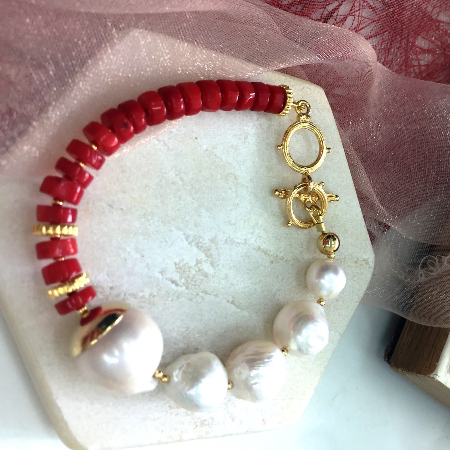 This bracelet is crafted from natural Edison Pearls with red corals and Japan golden-plated brass findings.