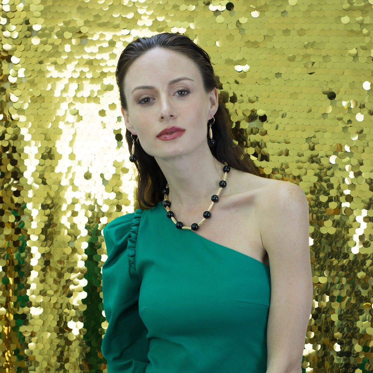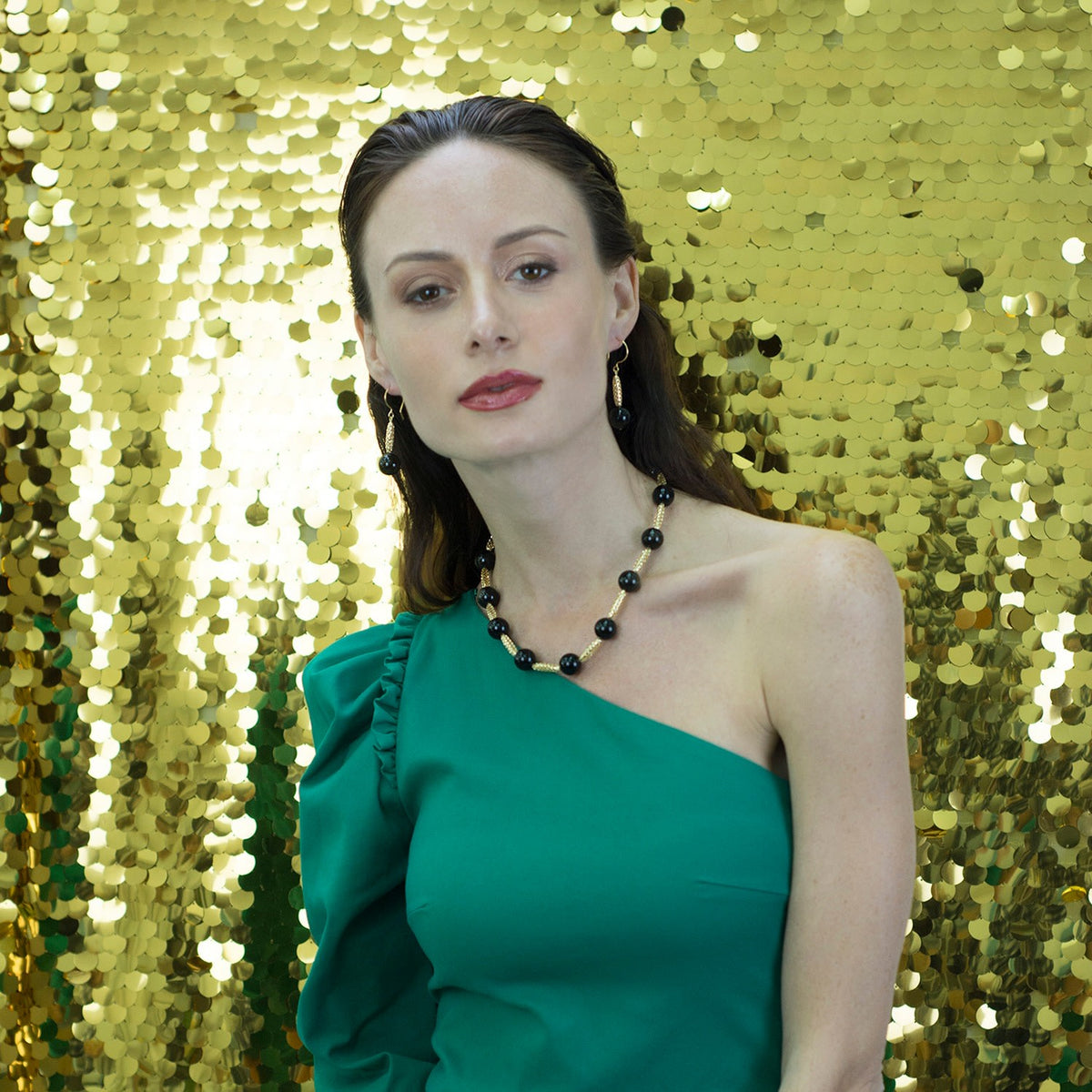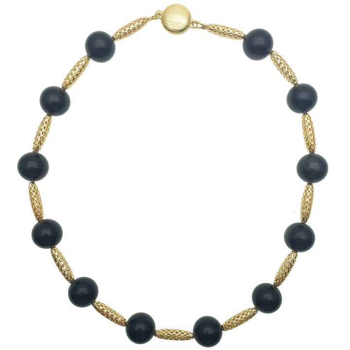 This Black Tiger Eyes Mesh Short Necklace by Farra is a simple but sophisticated accessory. This necklace is made of black tiger eyes and can be worn with a drop shoulder, blouse, or V-neck top.