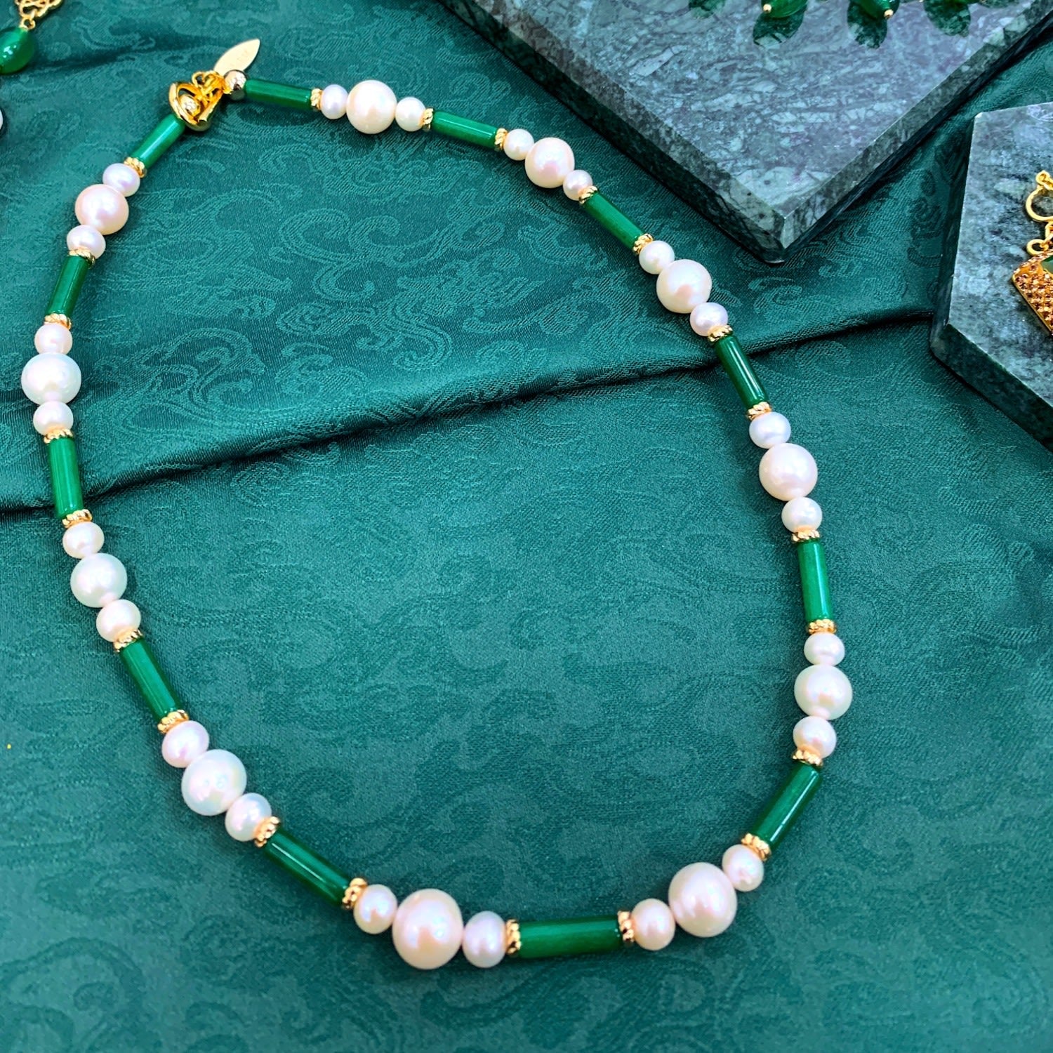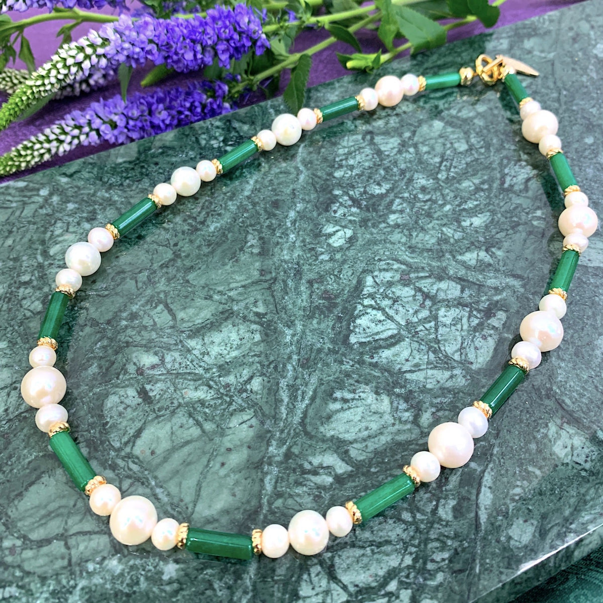 This handmade necklace features jade and freshwater pearls with Japan golden-plated brass findings.