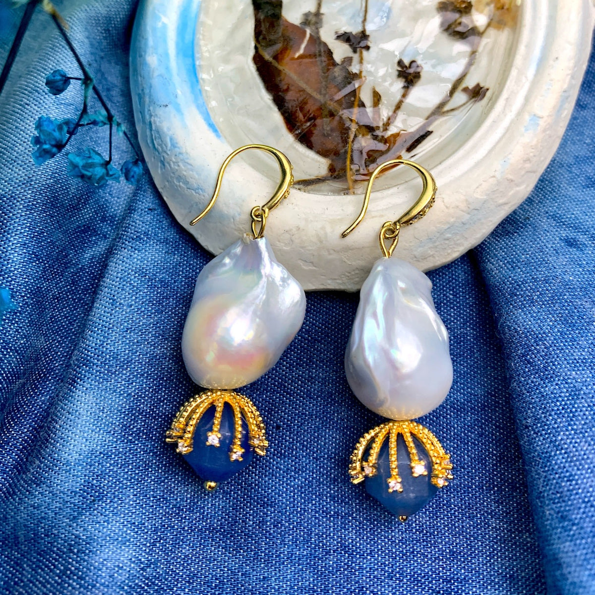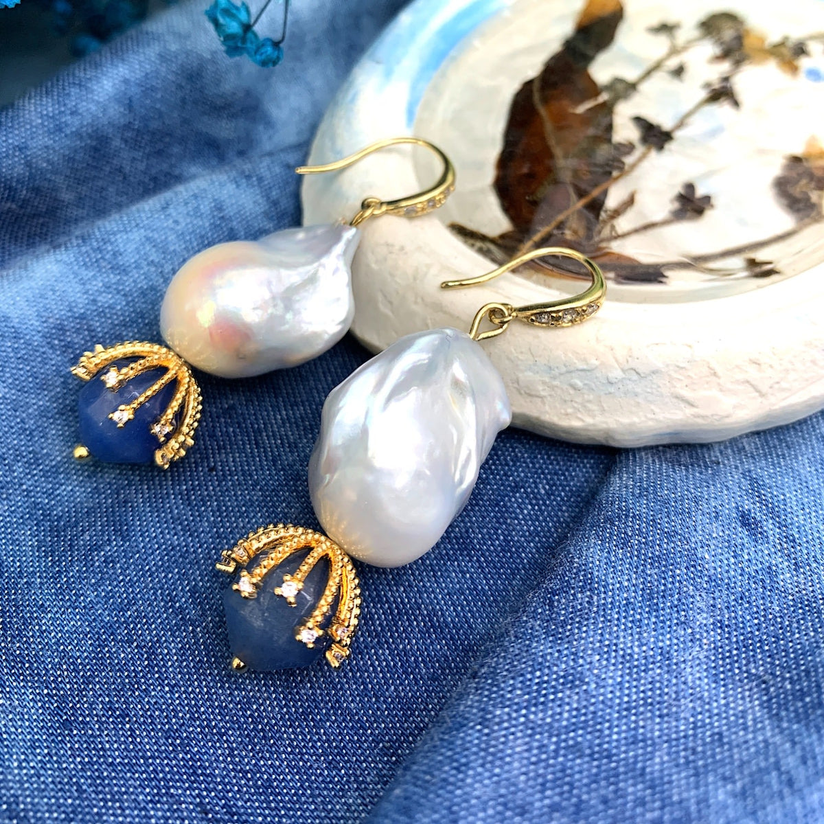 These earrings are handmade with baroque pearls and blue aventurine, and they are finished with Japanese golden-plated brass findings.