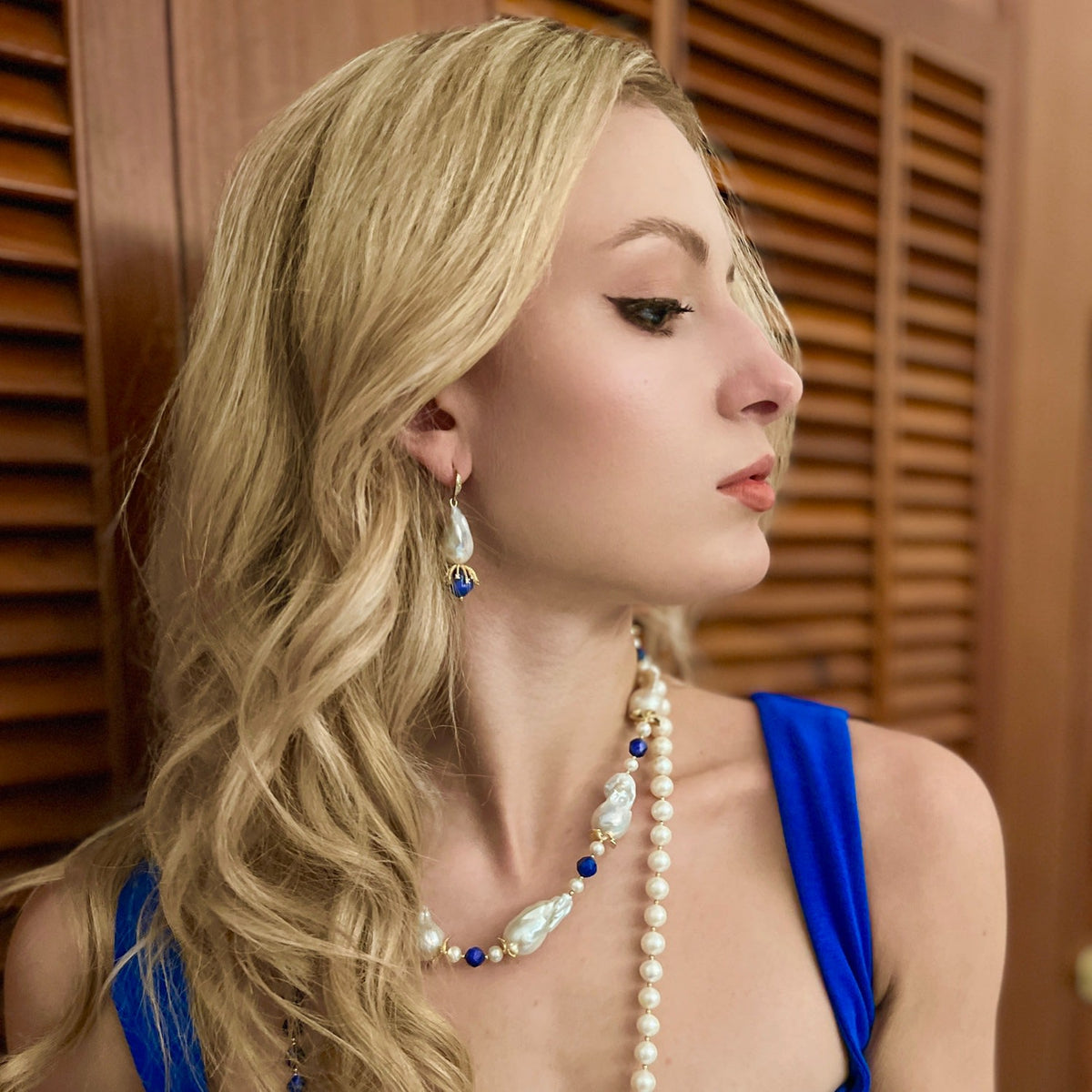 These Baroque Pearl With Blue Aventurine Dangle Earrings by Farra are a stunningly beautiful and elegant pair of handmade earrings. The graceful combination of a baroque pearl and a vibrant blue aventurine creates a sophisticated aesthetic perfect for any occasion. These earrings are a gorgeous gift for birthdays and anniversaries, symbolizing timeless beauty and natural charm.