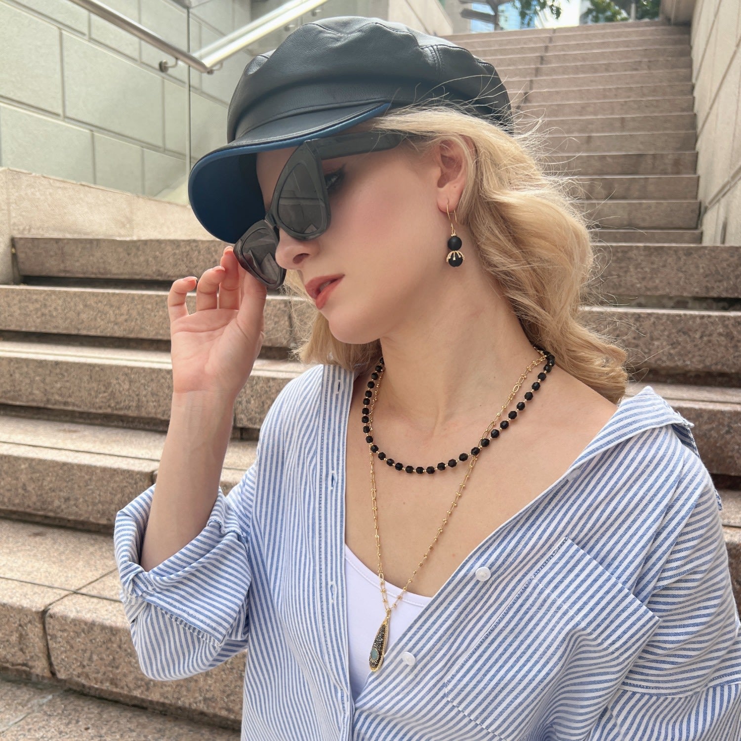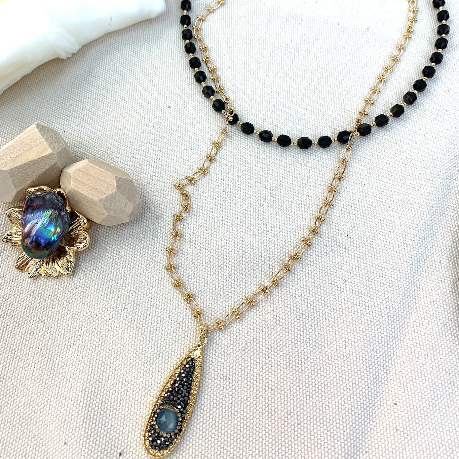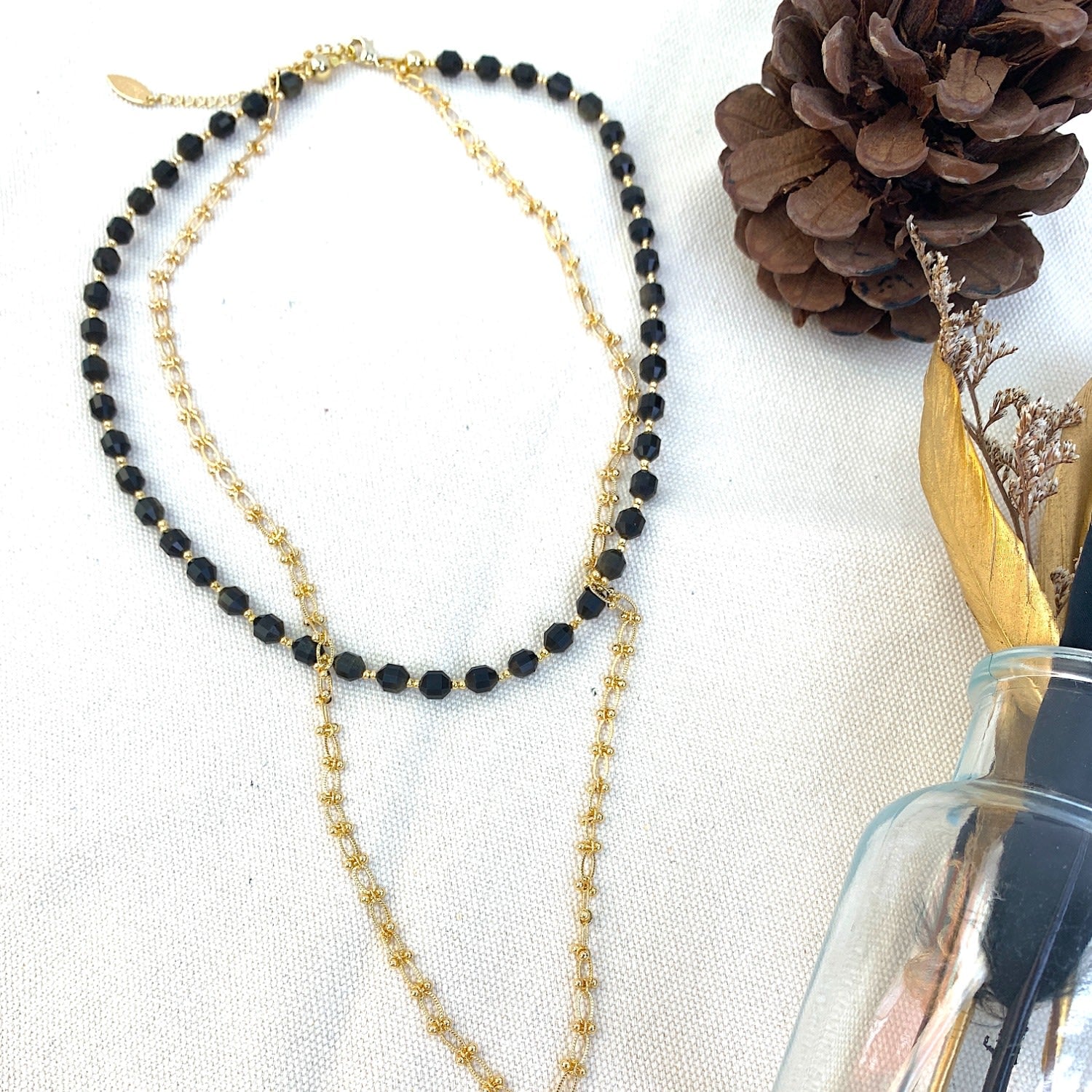 This necklace is made of black obsidian stones with a chain and a pendant, and features golden-plated brass findings from Japan.