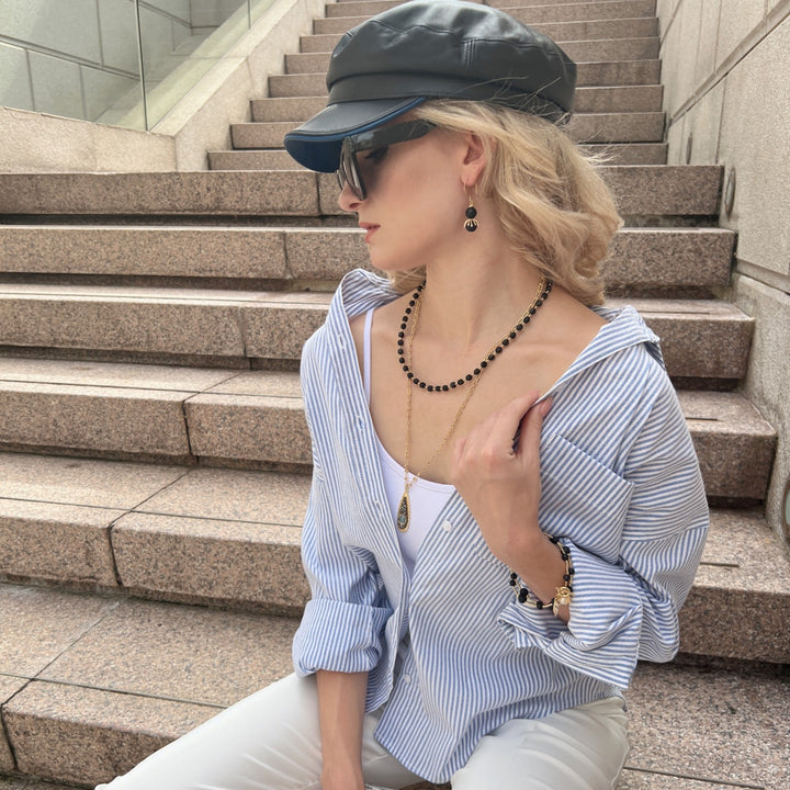 This Black Obsidian And Chain With Pendant Double Layers Necklace by Farra is a beautiful and sophisticated accessory. The double-layered design, featuring black obsidian stones and a delicate chain with a pendant, creates a gorgeous layered look. This necklace is perfect for adding a touch of elegance to a midi dress or a cozy knit, making it an excellent gift for any special occasion.