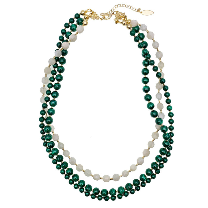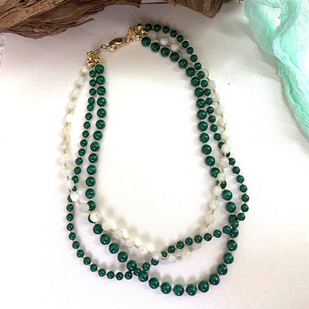 This handmade necklace is made of malachite and moonstone with Japan golden-plated brass findings.