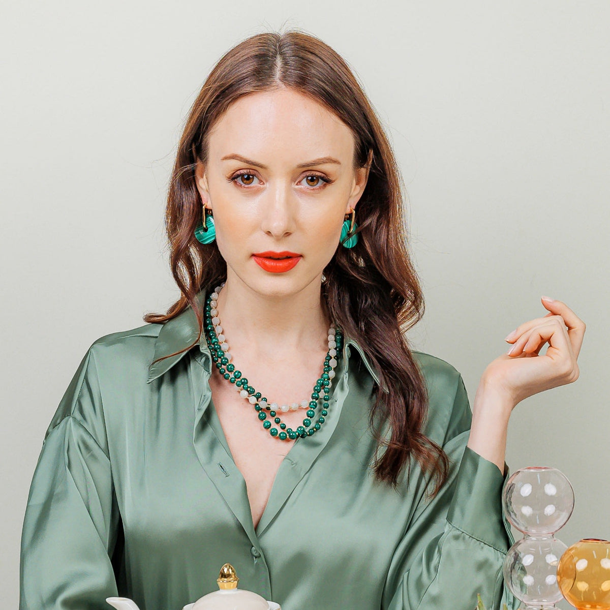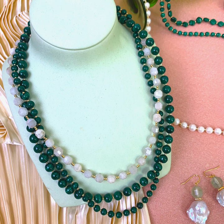 This Malachite With Moonstone Triple Strands Necklace by Farra is an elegant and brilliant handmade accessory. The triple-layered design, featuring malachite and moonstone, creates a stunning and luxurious look. This necklace is perfect for wearing with a blouse or dress to complete your look, and it also makes for a lovely gift.
