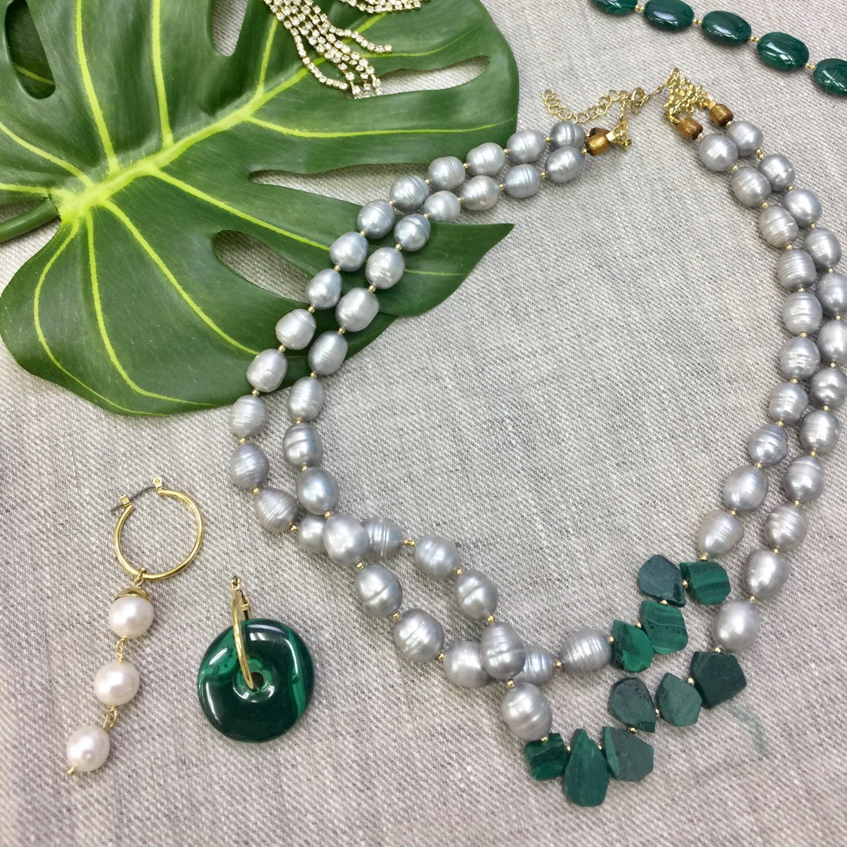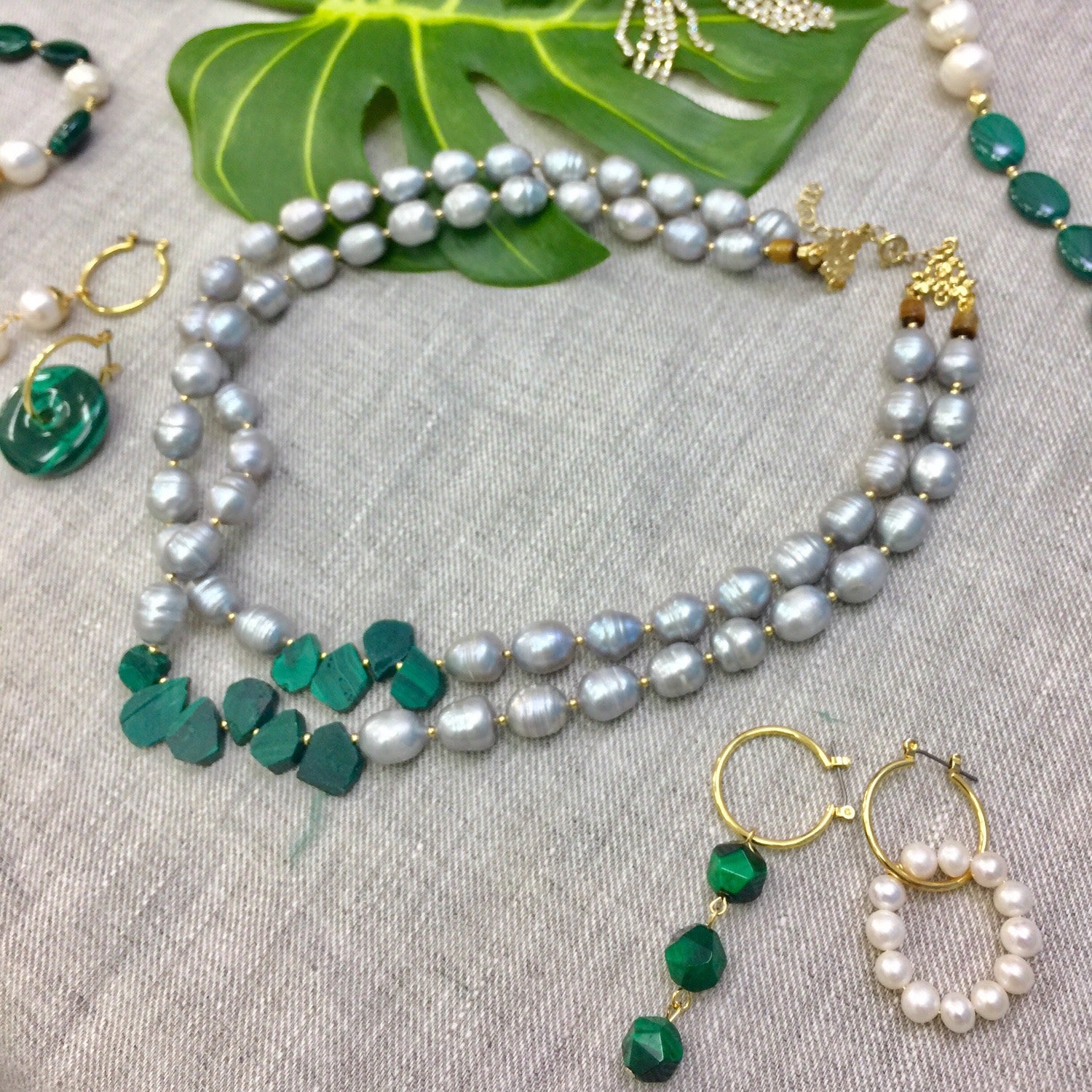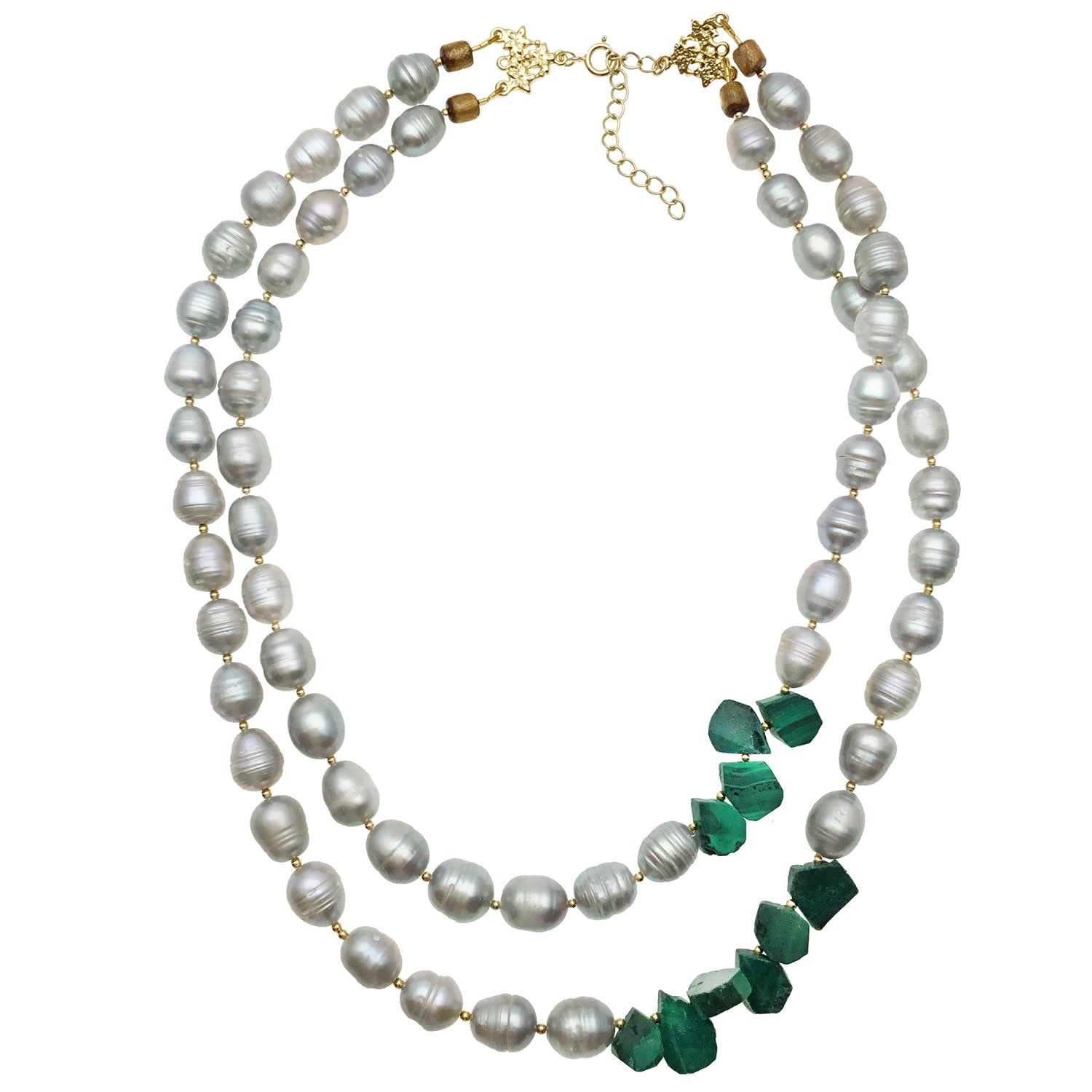 This double-strands necklace is made of gray freshwater pearls and natural malachite, with Japan golden-plated brass findings.