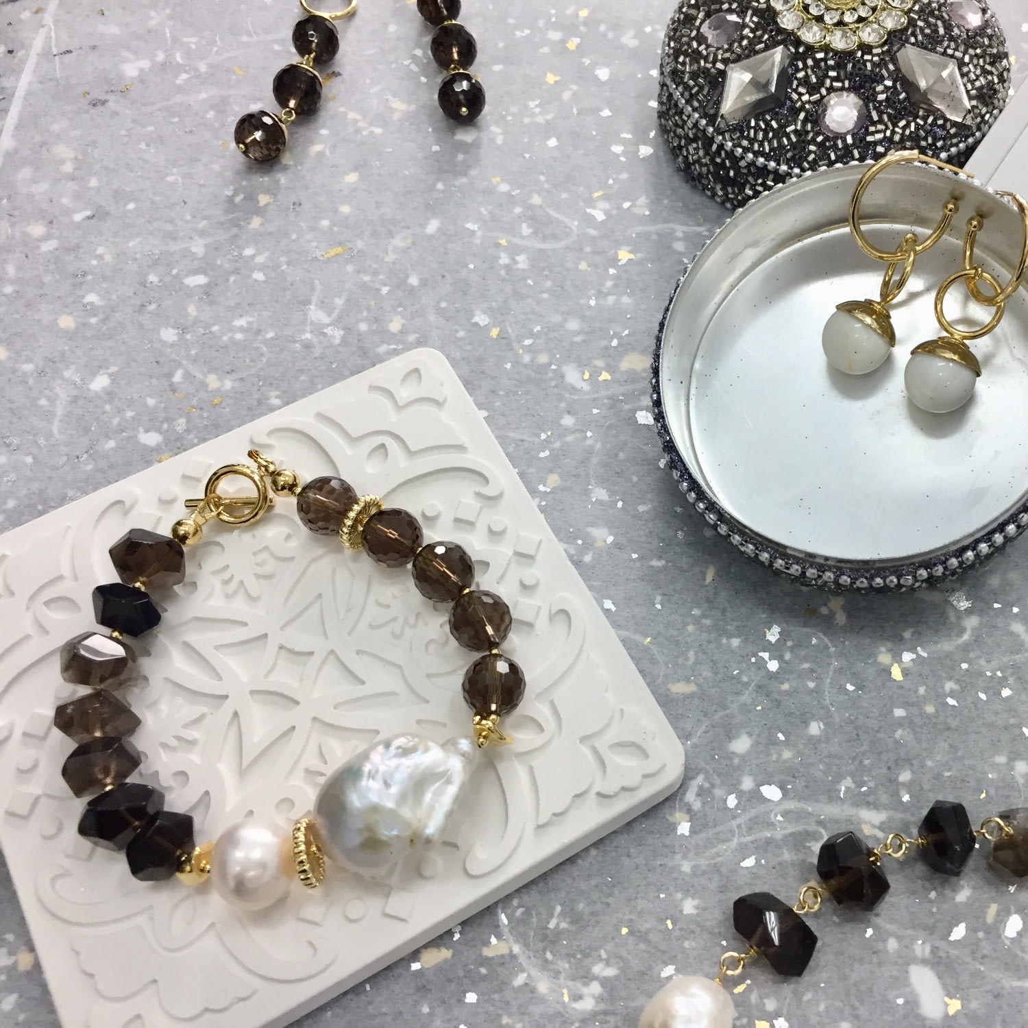 This bracelet is made of baroque pearls, freshwater pearls, black tiger eye stones, and smoky quartz, with Japan golden-plated brass findings.