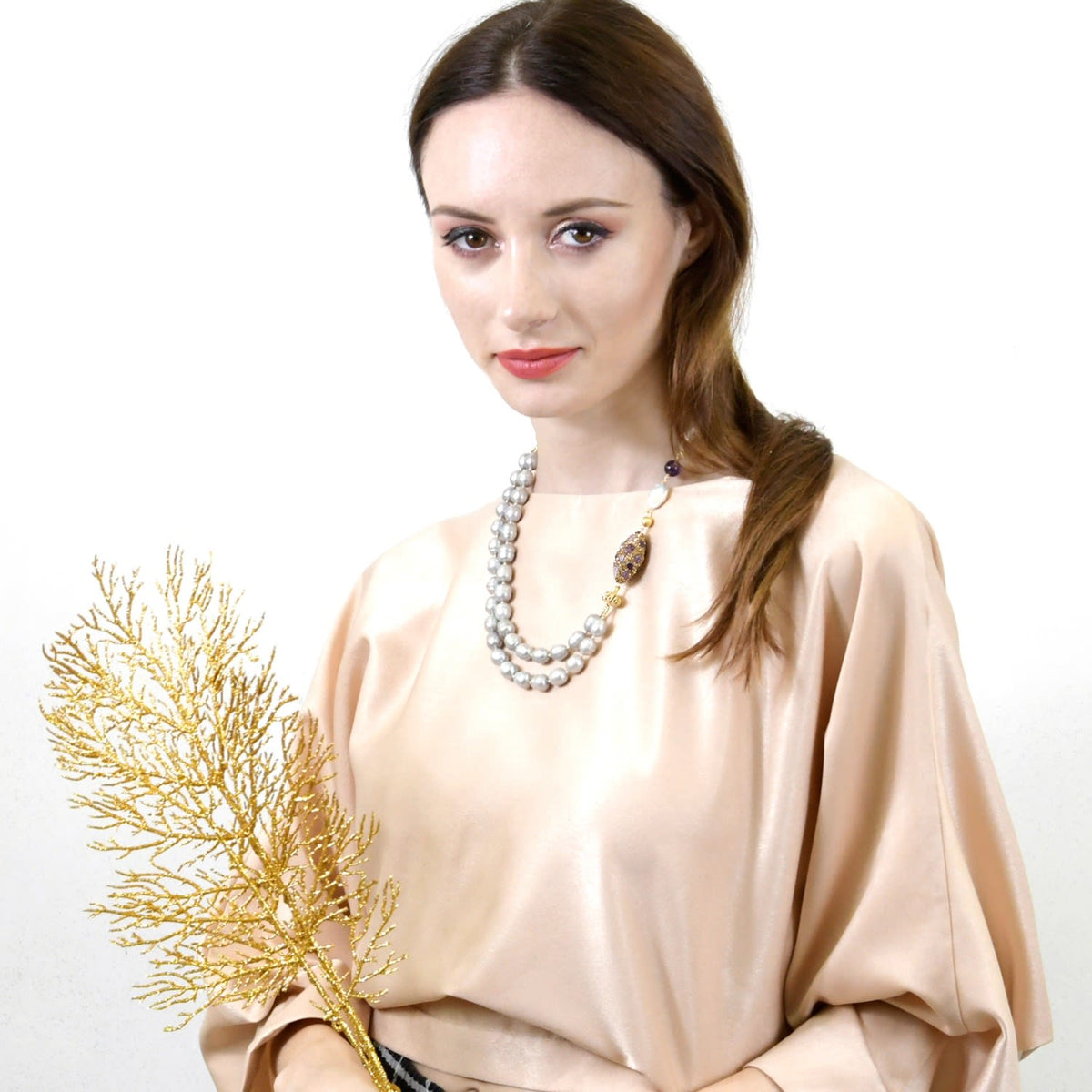 This White & Grey Freshwater Pearls With Amethyst Double Strands Necklace by Farra is a brilliant and timeless accessory. The double-layered design, featuring white and gray freshwater pearls, amethyst, and rhinestone-bordered amethyst, creates a beautiful and elegant look. This necklace is perfect for matching with any daily outfit for any season, and it makes a wonderful gift.