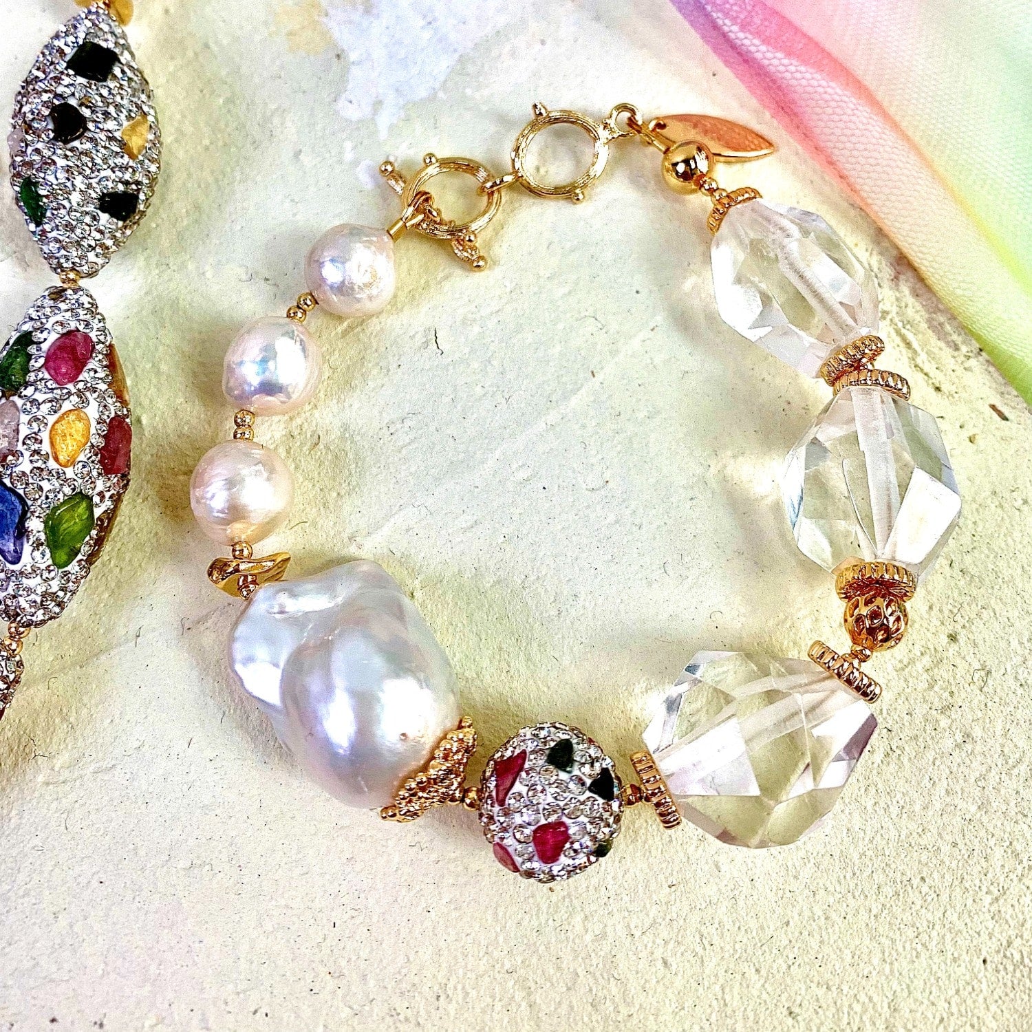 This bracelet features white quartz beads interspersed with baroque pearls.