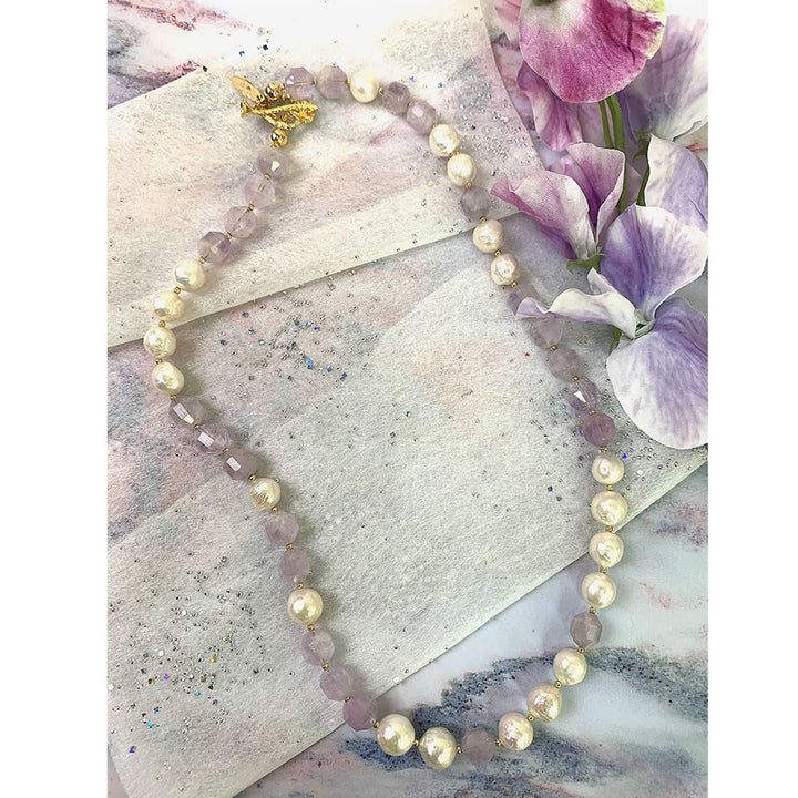 This handmade necklace is made of amethyst and freshwater pearls with Japan golden plated brass findings.