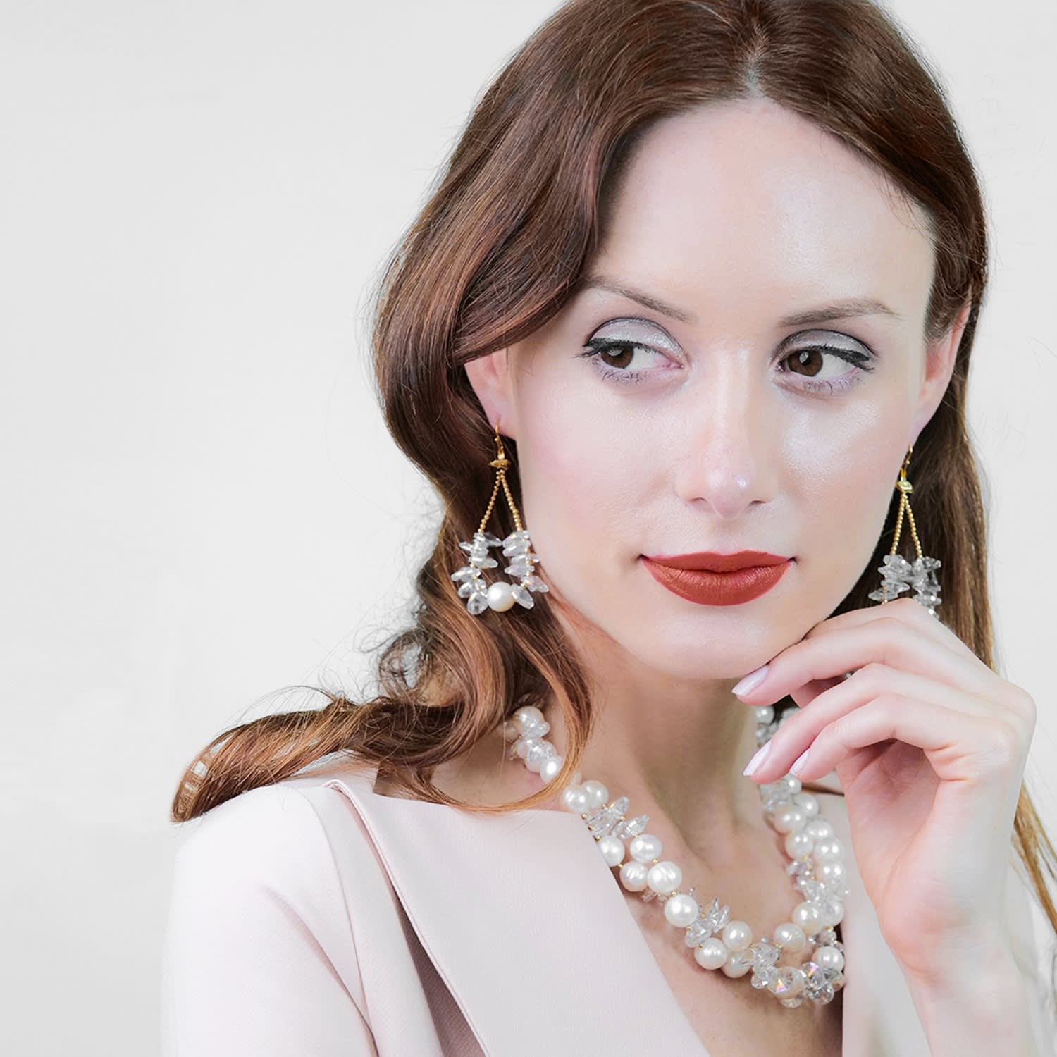 This Double Strands Freshwater Pearls & White Crystal Necklace by Farra is a brilliant and chic accessory. The combination of luminous freshwater pearls and sparkling white crystals creates a stylish and elegant choker. Its double-strand design is perfect for effortlessly matching any outfit, making it a versatile piece for shopping, meeting friends, or special events.