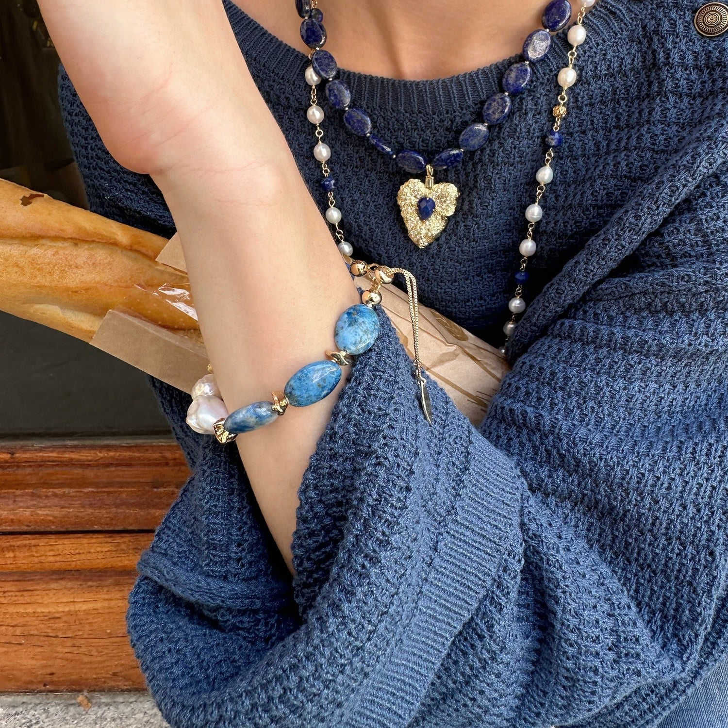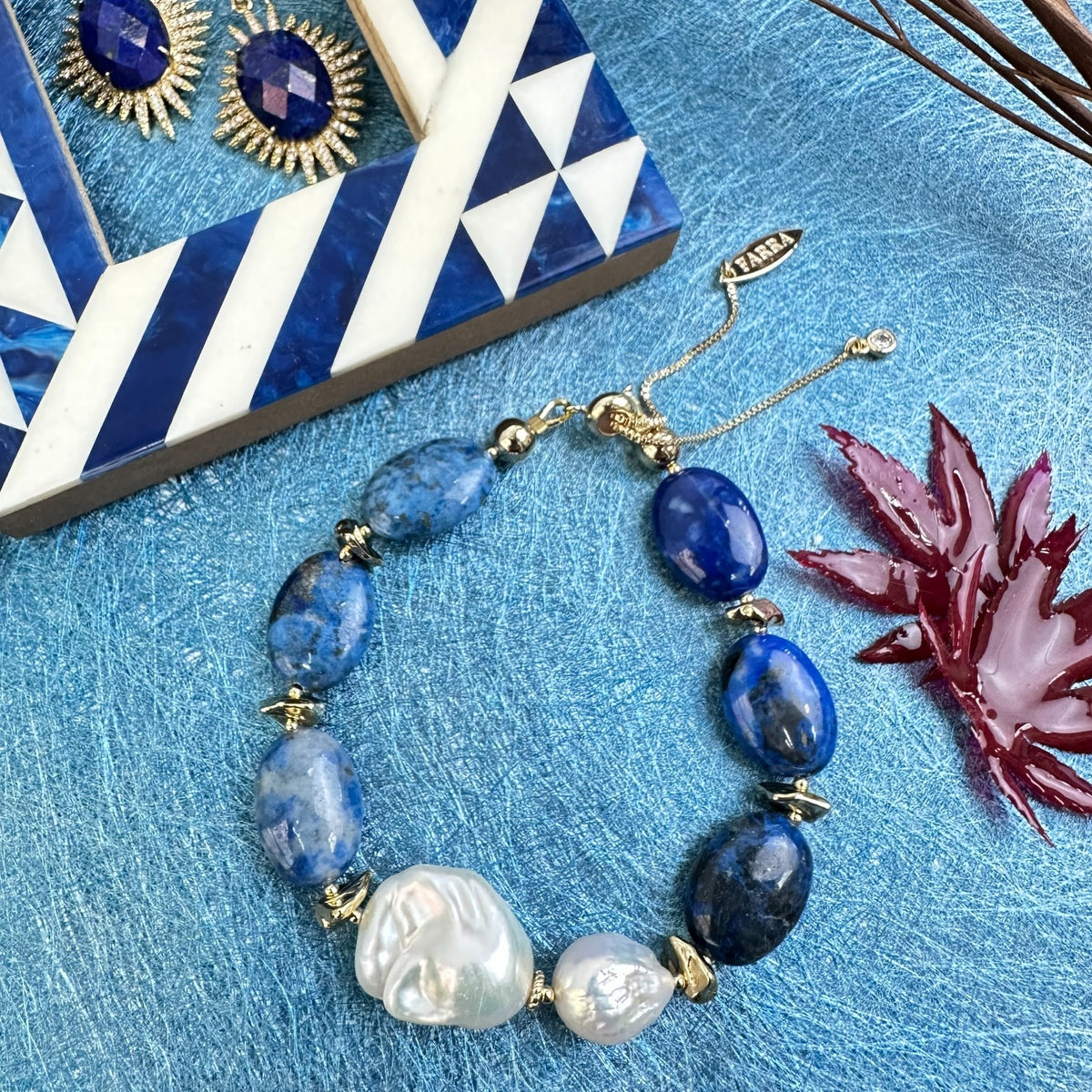 This Agate With Baroque Freshwater Pearl Adjustable Bracelet by Farra is a unique and elegant accessory. The subtle beauty of the lapis and baroque pearls adds a touch of sophistication to any outfit. This adjustable bracelet is wear-resistant and perfect for casual days, easily paired with jeans or knitwear for a refined, everyday look.