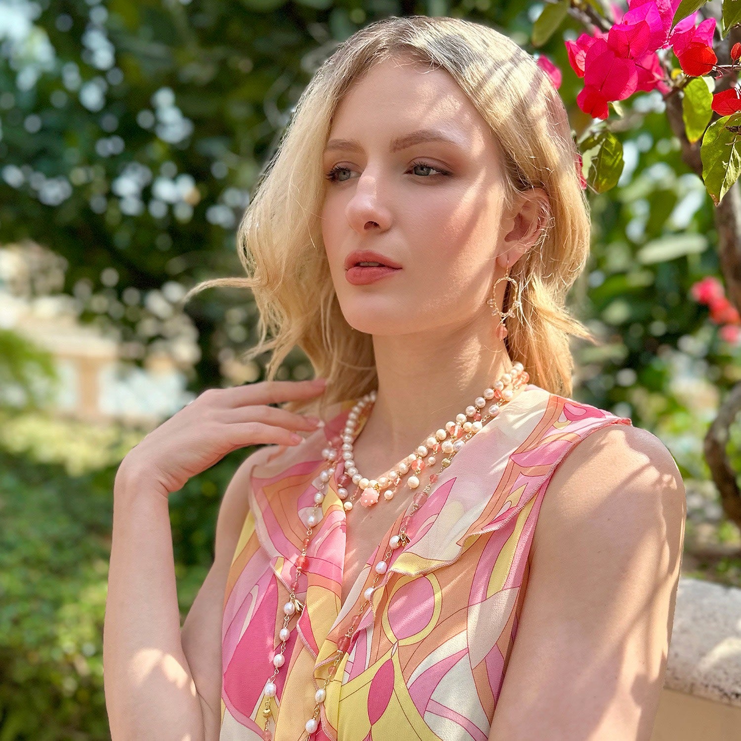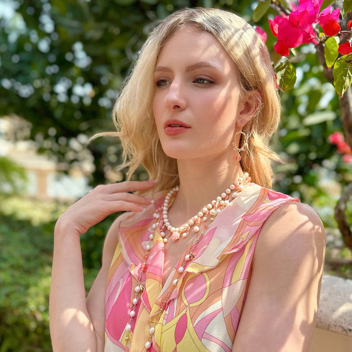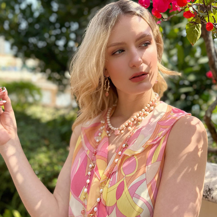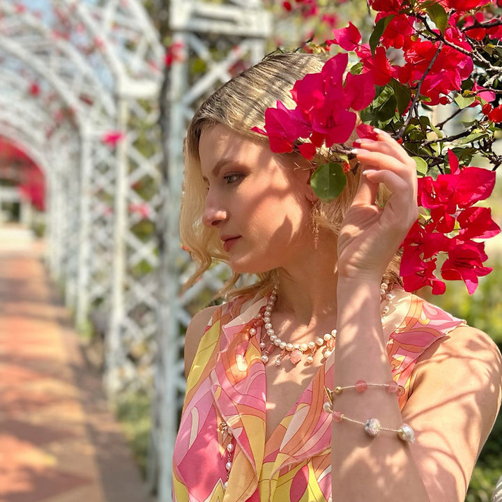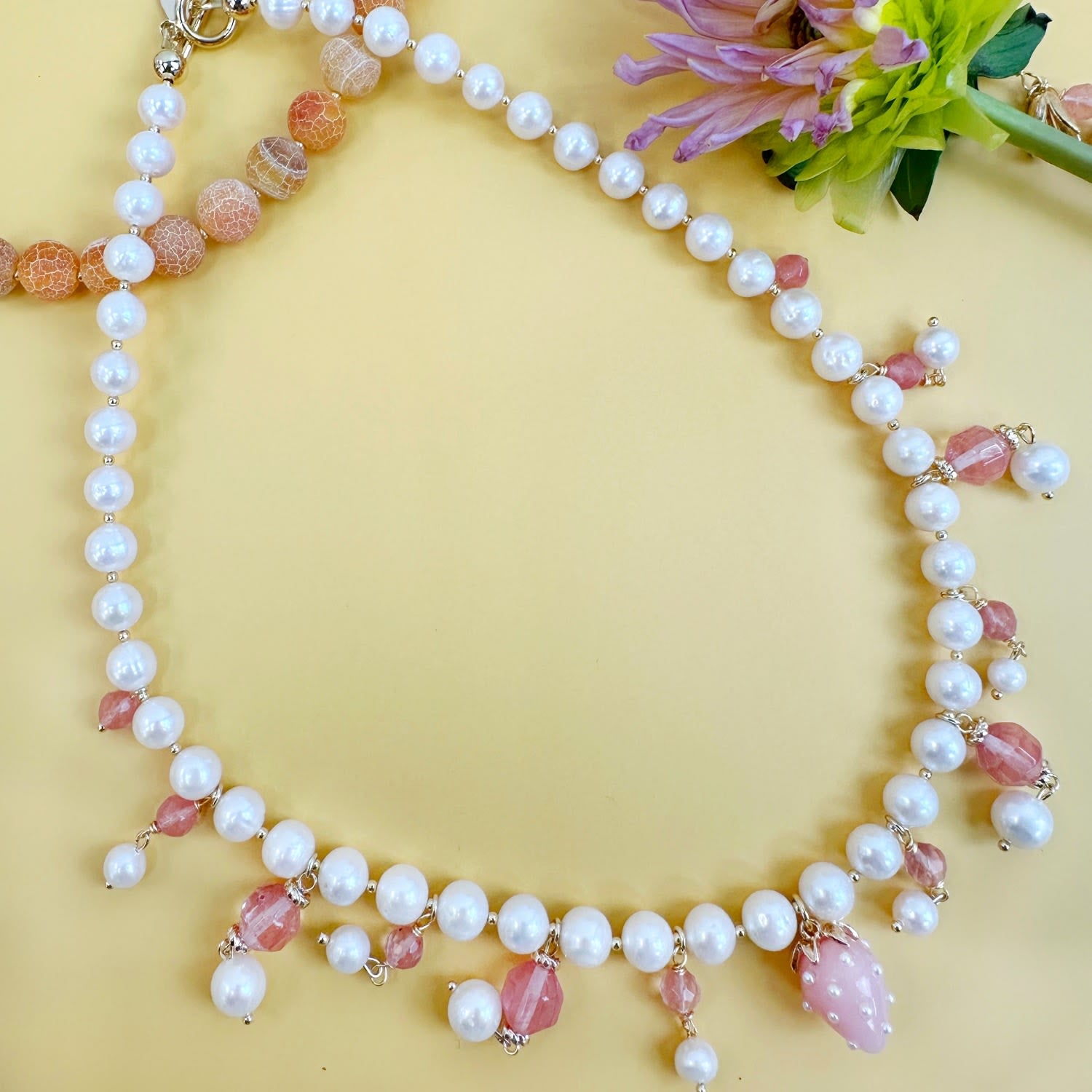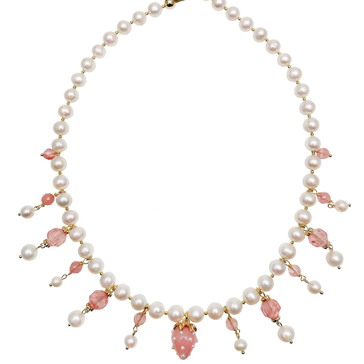 This necklace features freshwater pearls and watermelon quartz dangles.