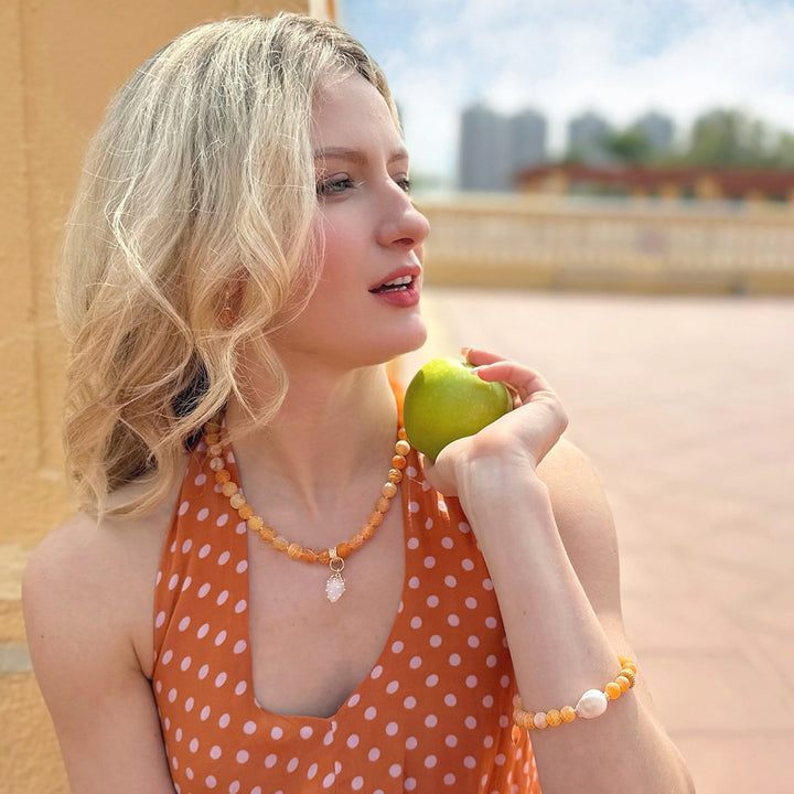 This Agate With Strawberry Pendant Necklace by Farra is a fun and charming handmade accessory. The agate stones are complemented by a glass strawberry dangle, adding a whimsical touch. This necklace is an ideal addition to your summer wardrobe, lending a sense of relaxation and playful style to your everyday look.