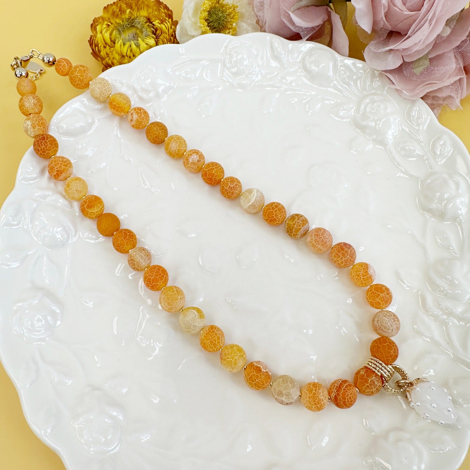 This handmade necklace features agate stones and a glass strawberry dangle with Japan golden-plated brass findings.