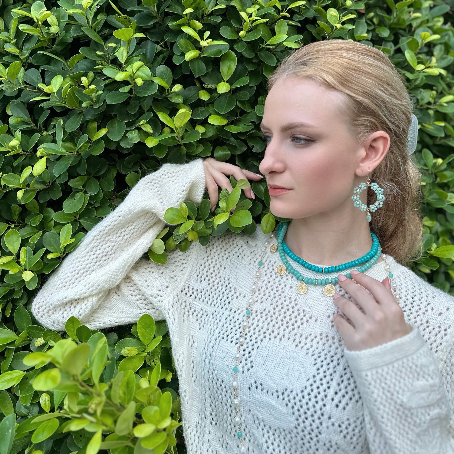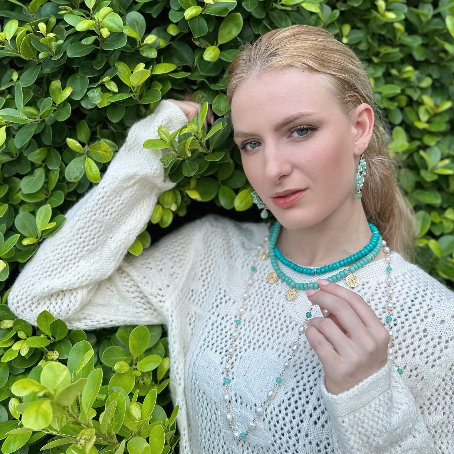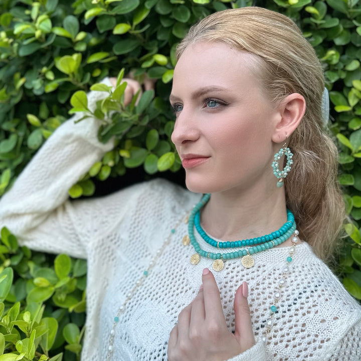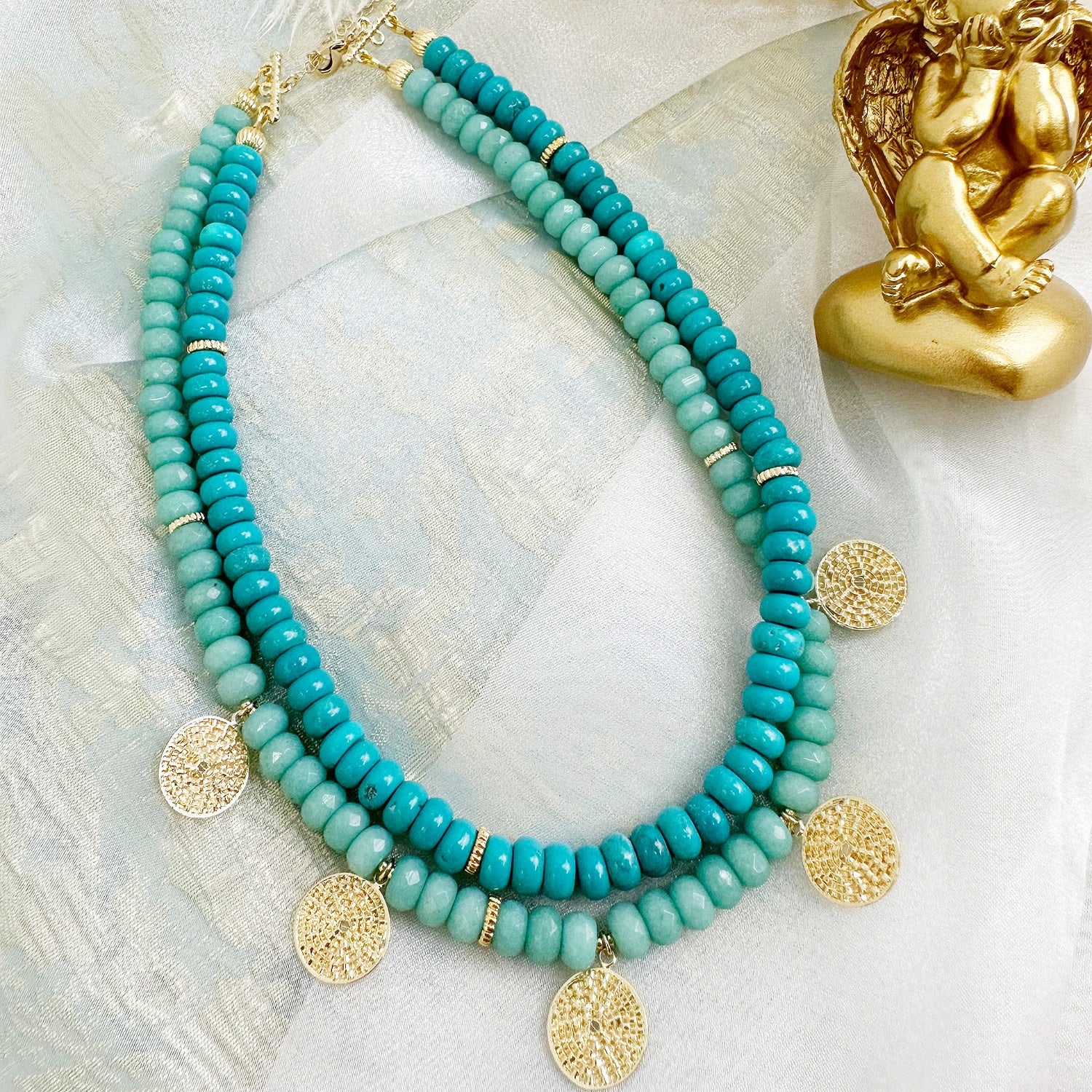 Turquoise & Amazonite Double Strands Coin Charm Statement Necklace