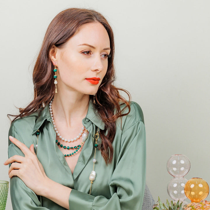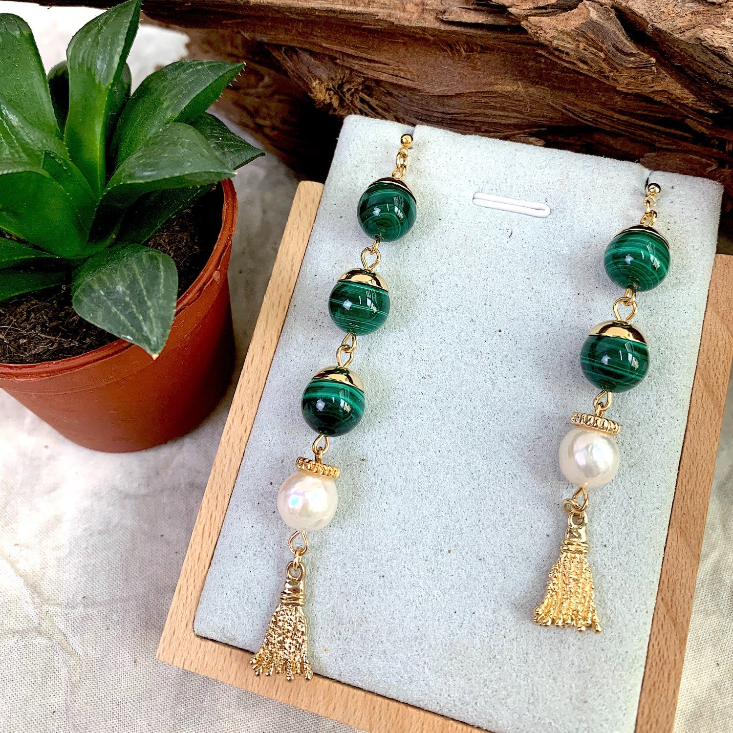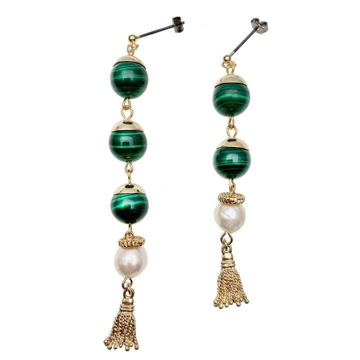 These elongated earrings are made of malachite and freshwater pearls with Japan golden-plated brass findings.