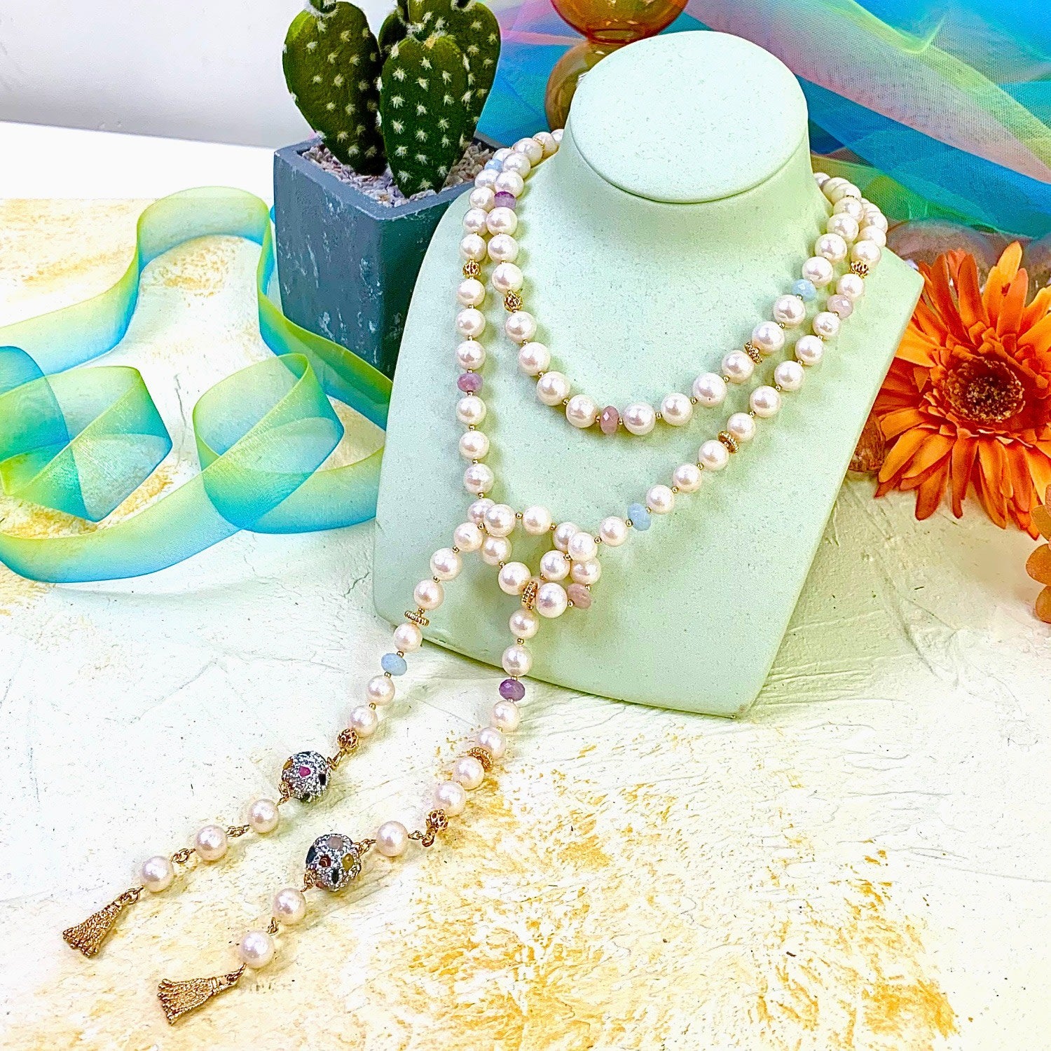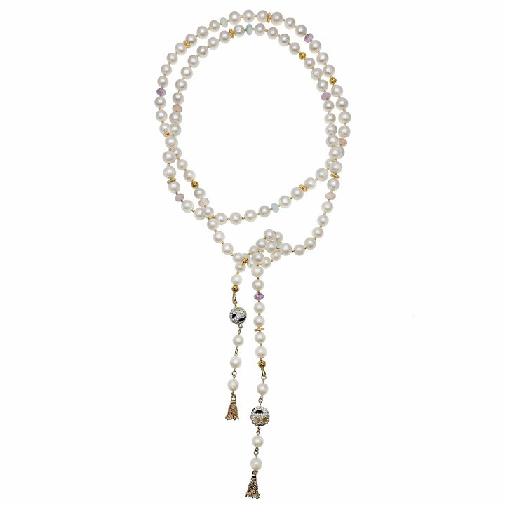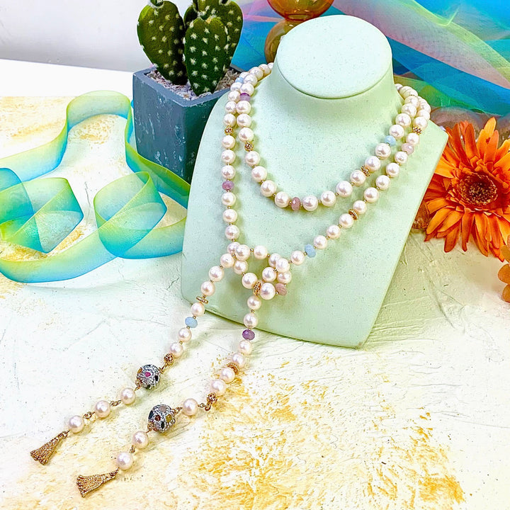 Multi-Way Freshwater Pearls With Rhinestones Bordered Tourmaline Open Ended Long Necklace