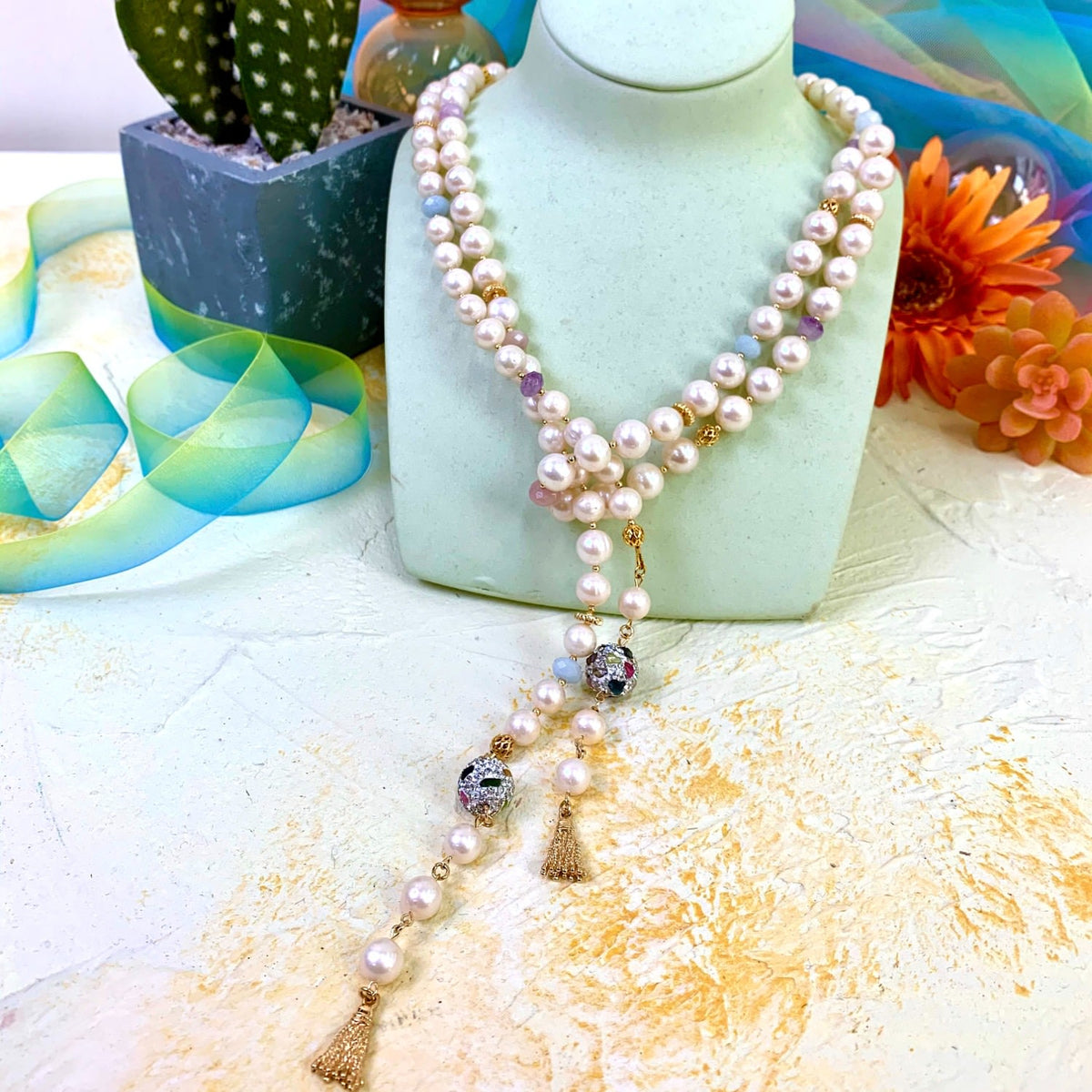 This multi-way necklace is made of freshwater pearls with rhinestones bordered tourmaline and Japan golden-plated brass findings.