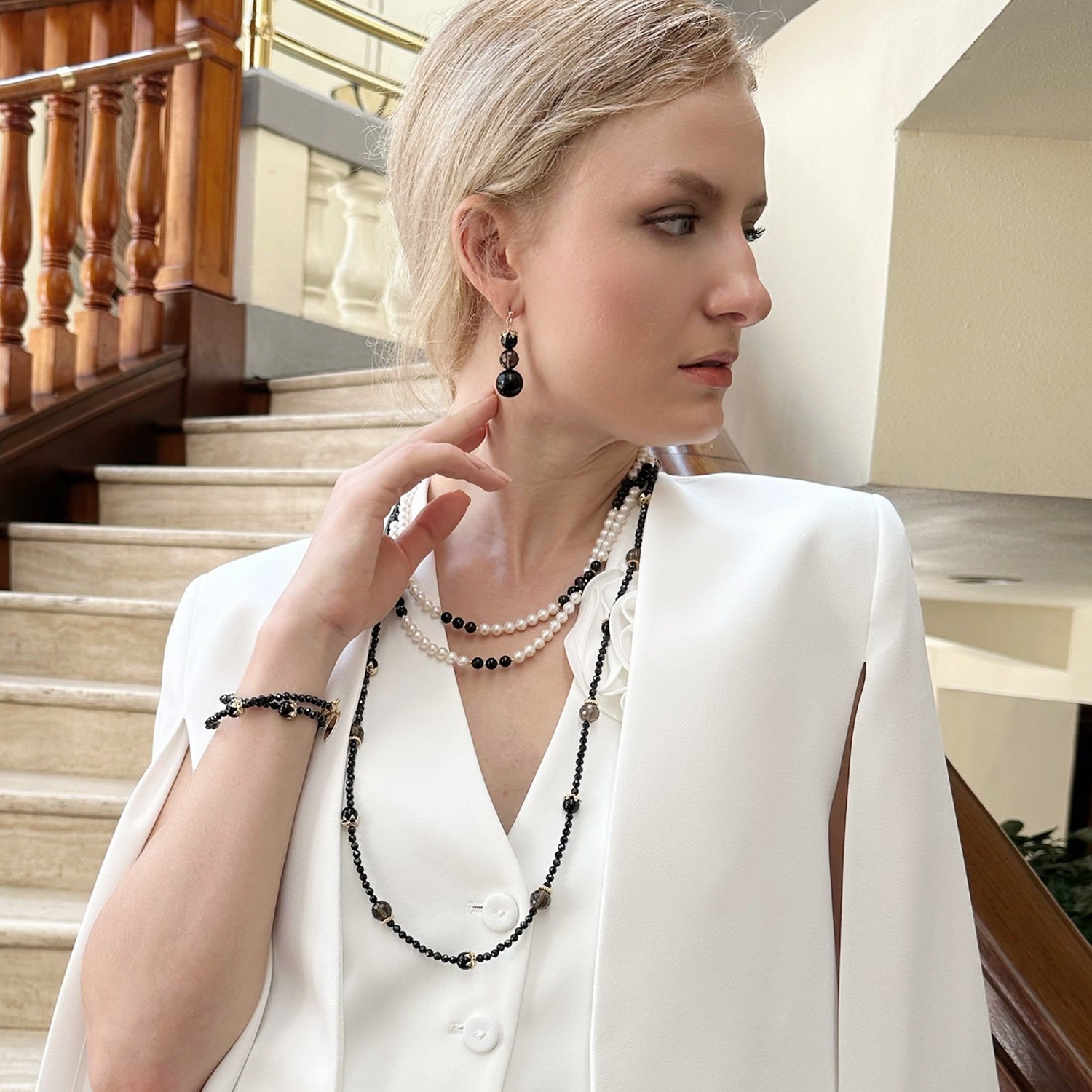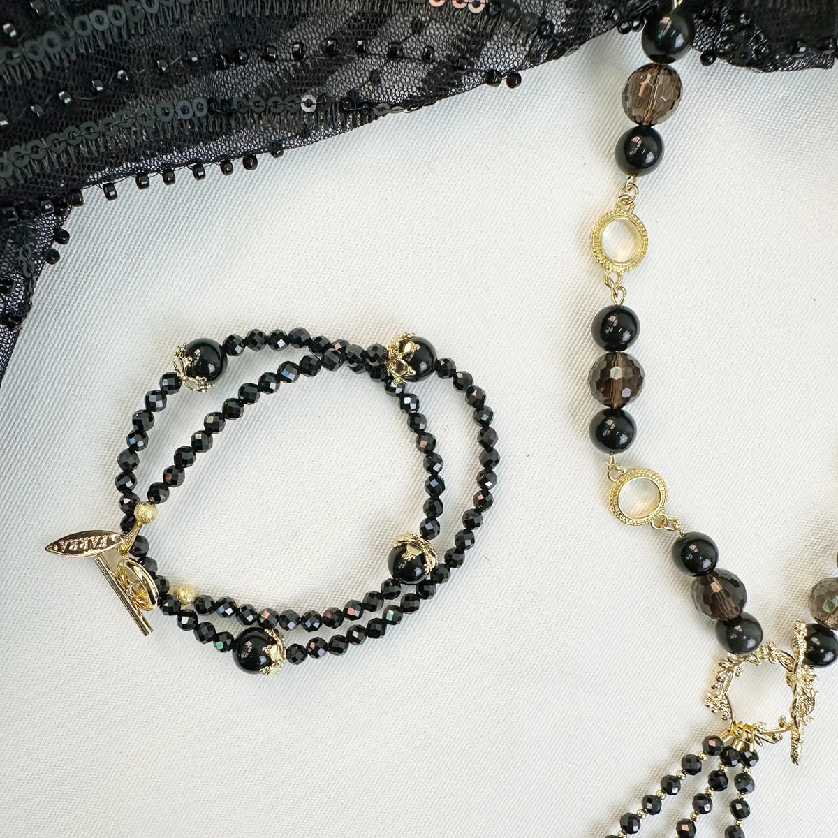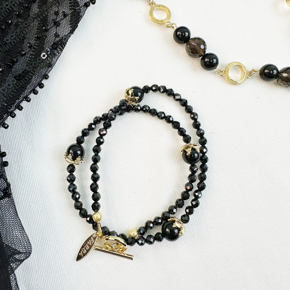 This Timeless Obsidian Double Wrapped Bracelet by Farra is a beautiful and versatile accessory. Crafted from high-quality black obsidian, this double-wrapped bracelet can also be worn as a choker. Its timeless design adds a touch of elegance and style to any outfit, making it a perfect gift for any occasion.