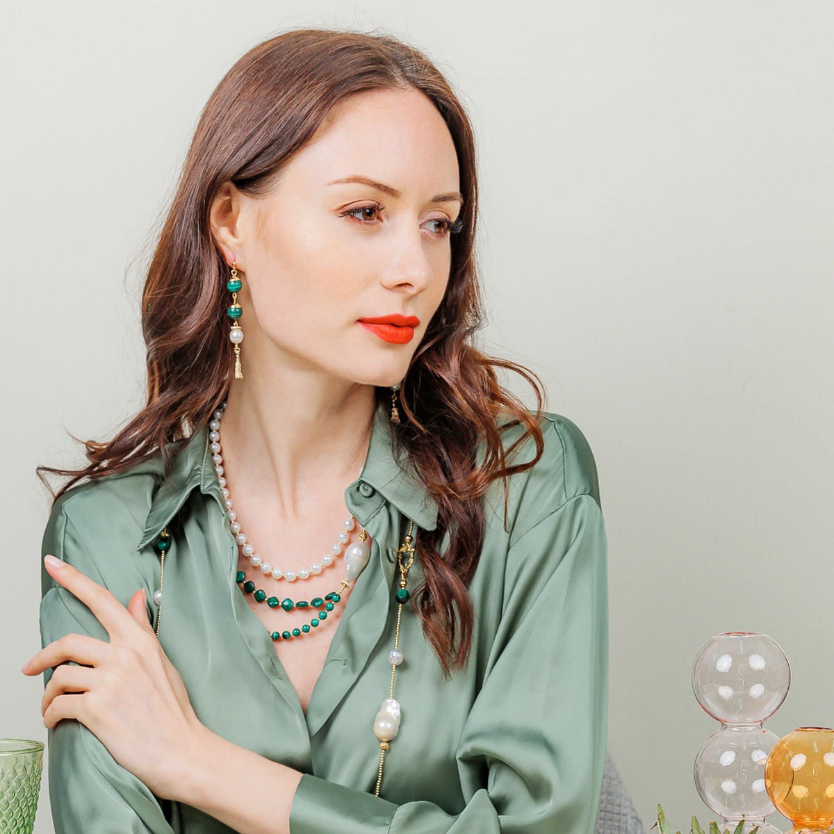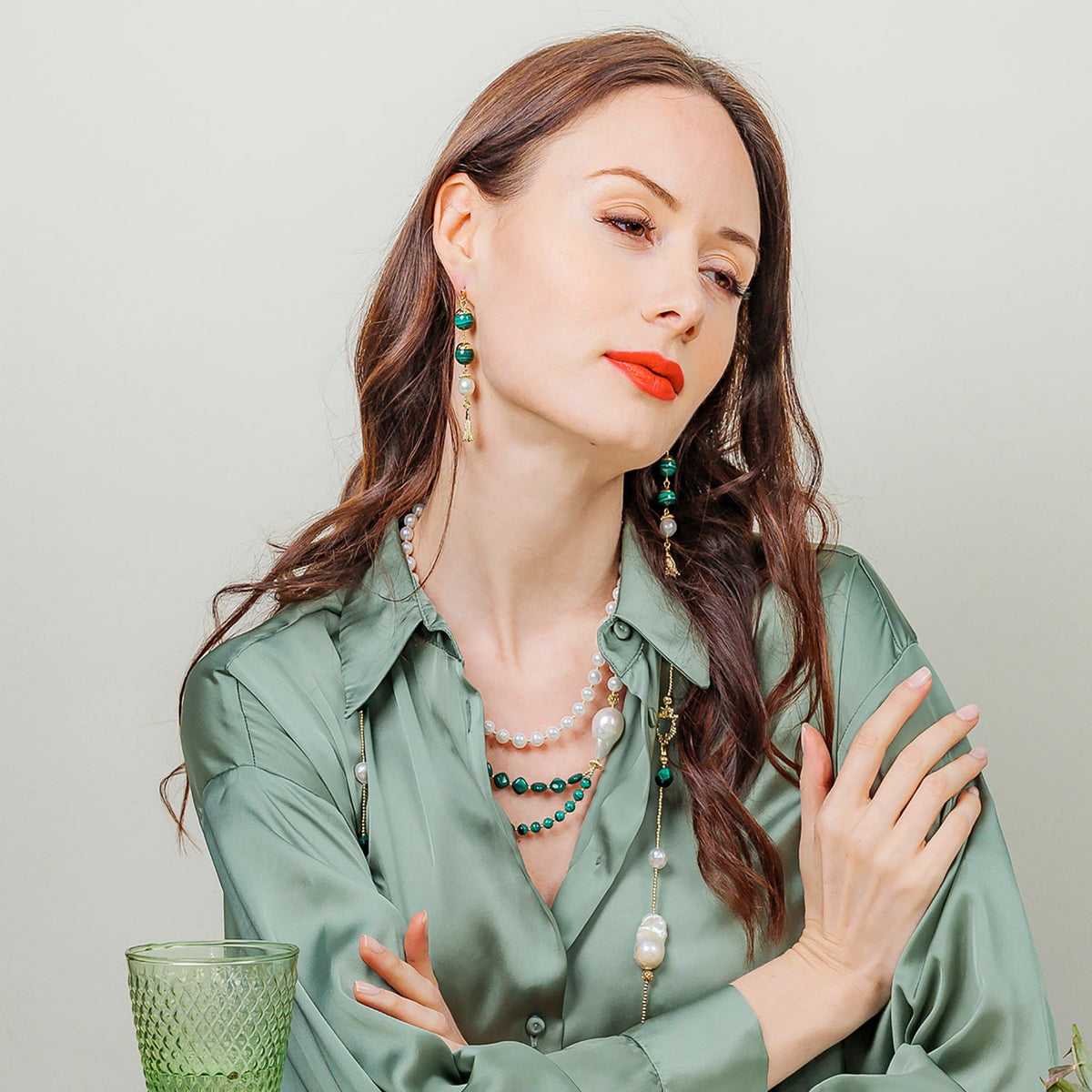 These Elongated Malachite Earrings by Farra are a simple yet sophisticated accessory. The elongated design features malachite and freshwater pearls, creating a graceful and elegant look. These earrings can be worn for any occasion and are perfect for matching with a Farra Malachite necklace to complete your look.
