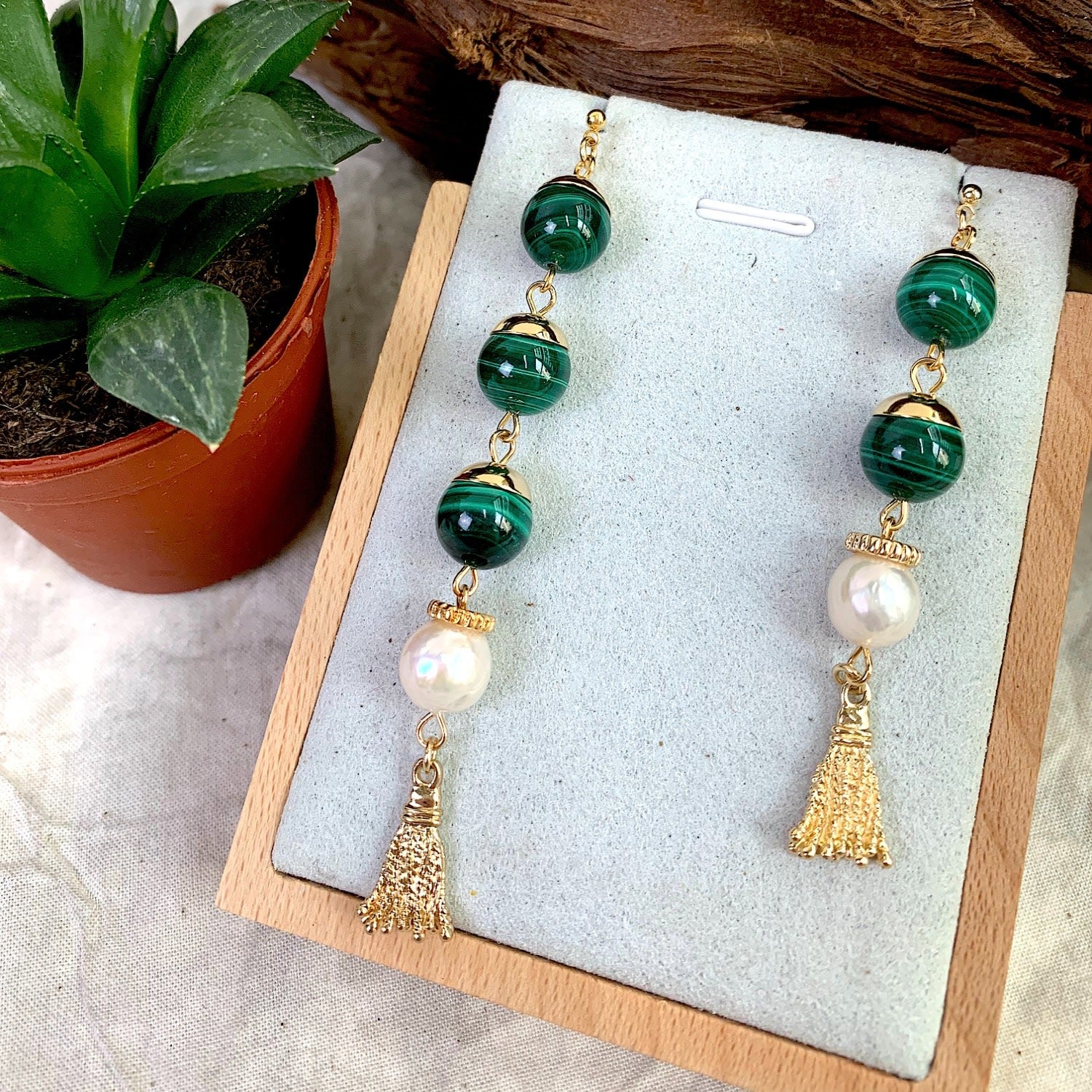 These elongated earrings are made of malachite and freshwater pearls with Japan golden-plated brass findings.