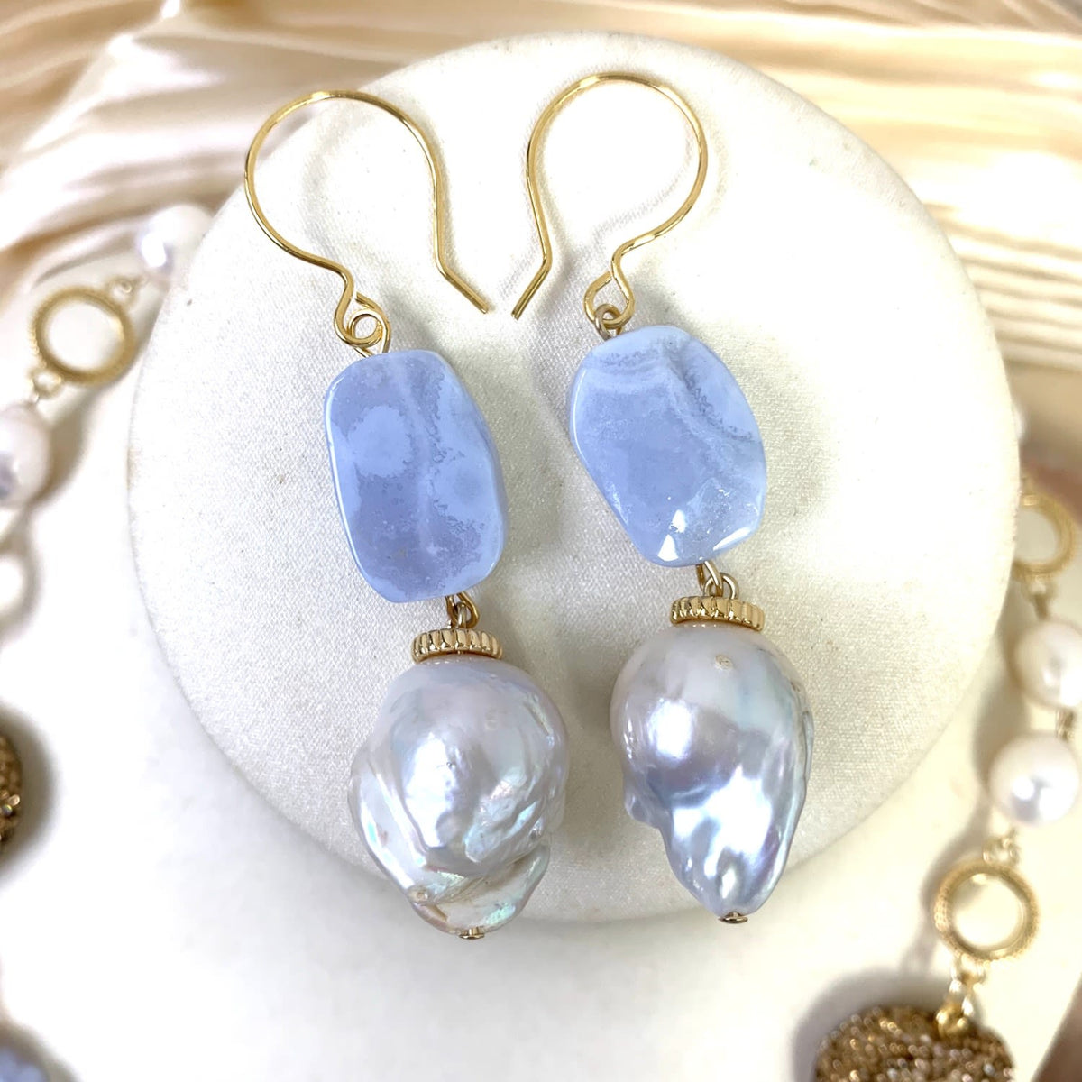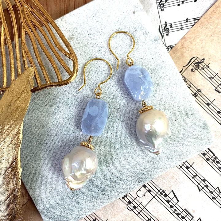 These handmade hook earrings are made of blue lace agate with a baroque pearl and Japan golden-plated brass findings.