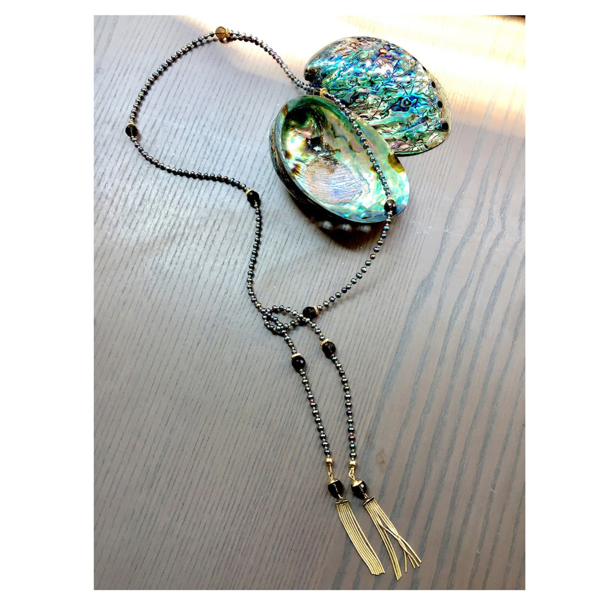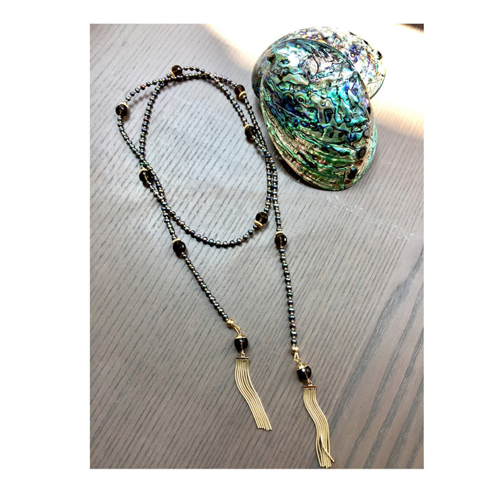 This Black Tiger Eye Open Ended Long Necklace by Farra is a versatile and elegant accessory. It can be worn as a double-wrapped or long necklace to create your own style. The necklace features freshwater pearls and smoky quartz with golden brass findings.