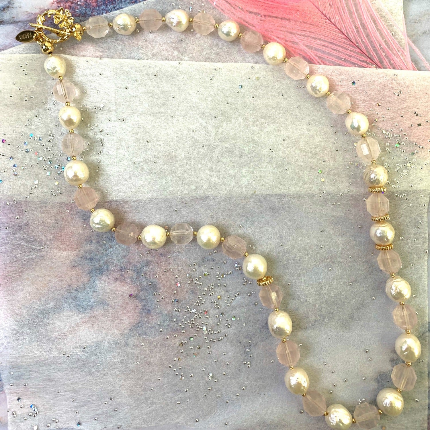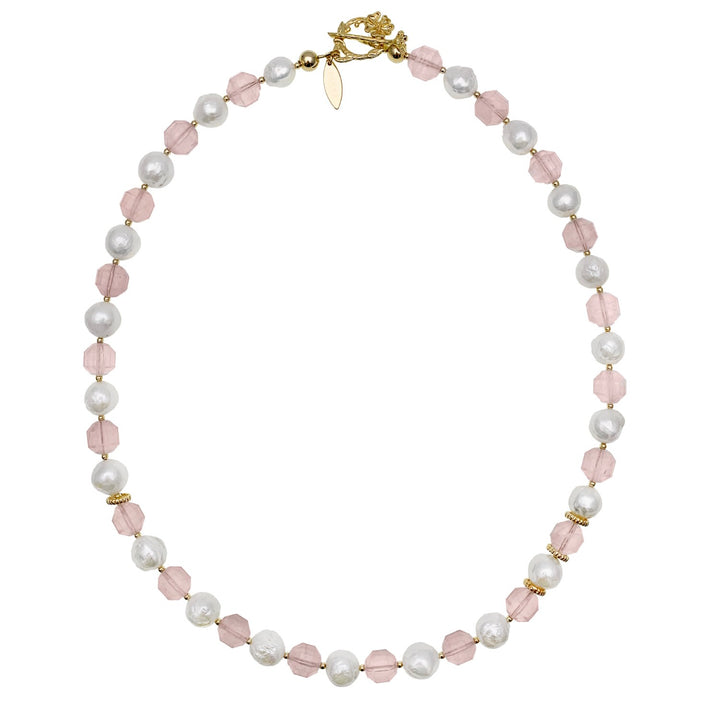 This handmade short necklace is made of rose quartz with freshwater pearls and Japan golden-plated brass findings.