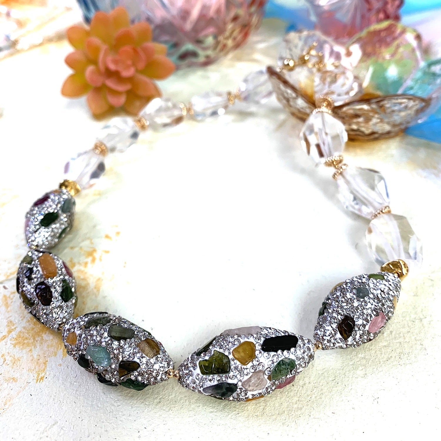 This handmade choker necklace is made of white quartz and rhinestones-bordered tourmaline with Japan gold-plated brass findings.