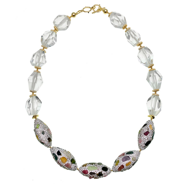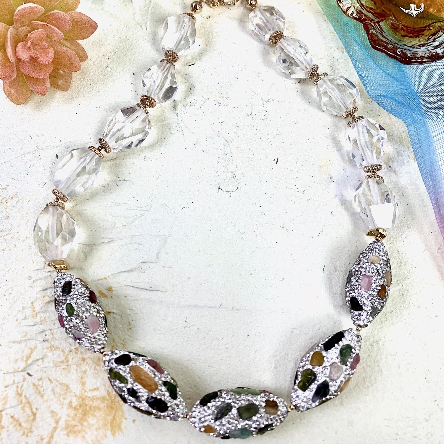 White Quartz With Rhinestones Bordered Tourmaline Short Necklace