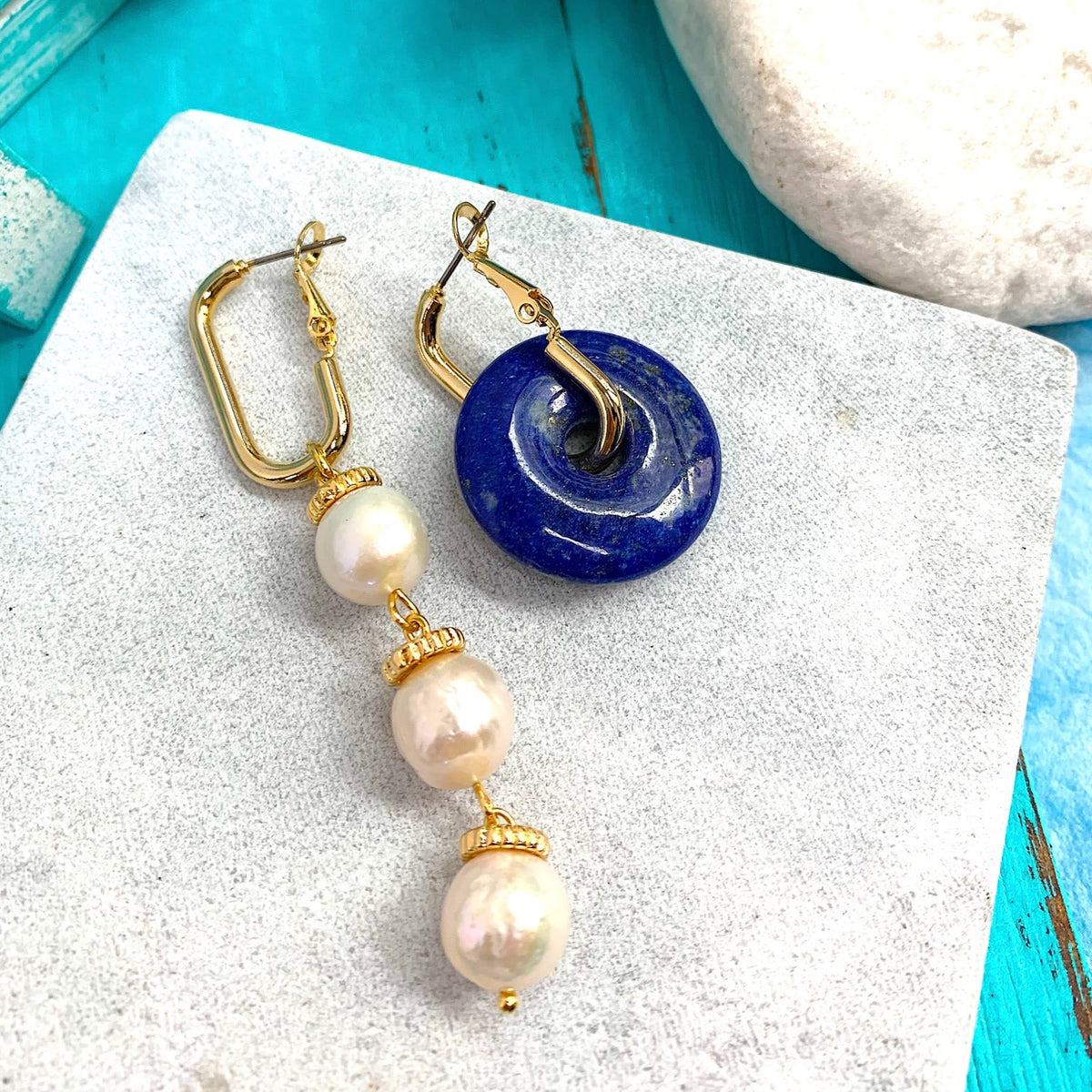 These clip-on pearl earrings are made of lapis with freshwater pearls and Japan golden-plated brass findings. They have an asymmetric design.