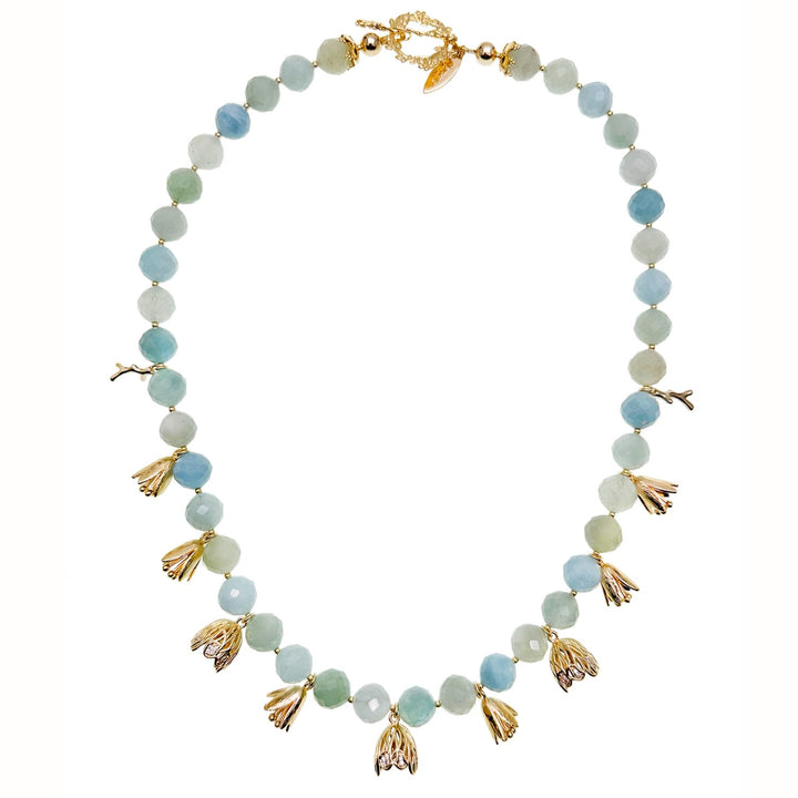 This pendant necklace is made of high-quality aquamarines and features floral charms and Japan findings.