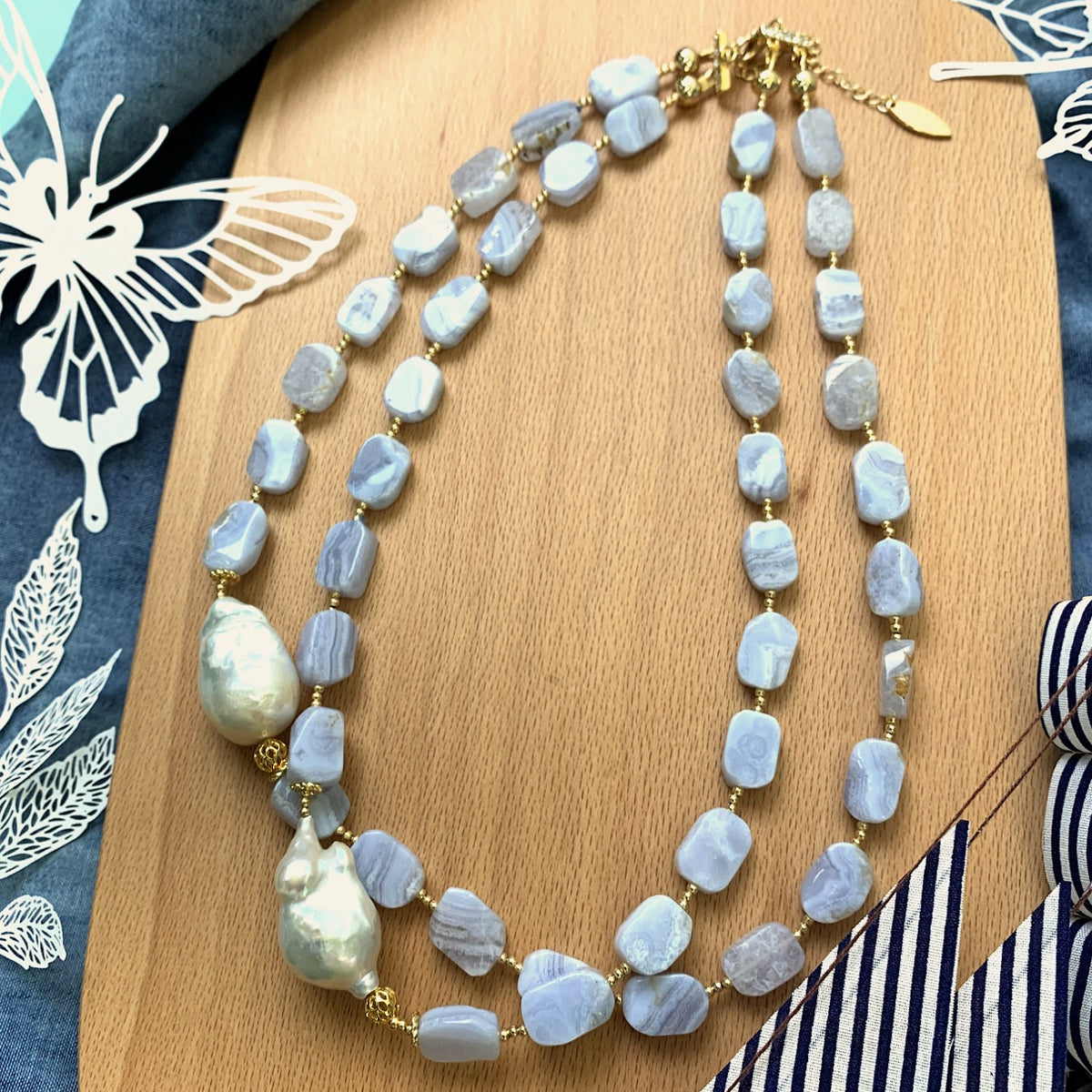 This handmade pendant necklace is made of blue lace agate with baroque pearls and Japan golden-plated brass findings.