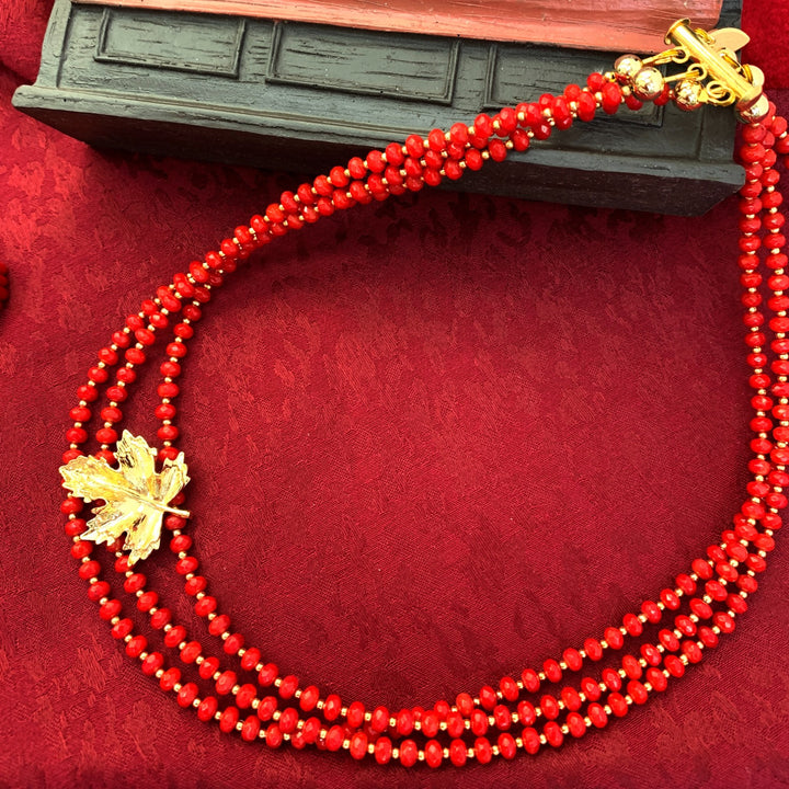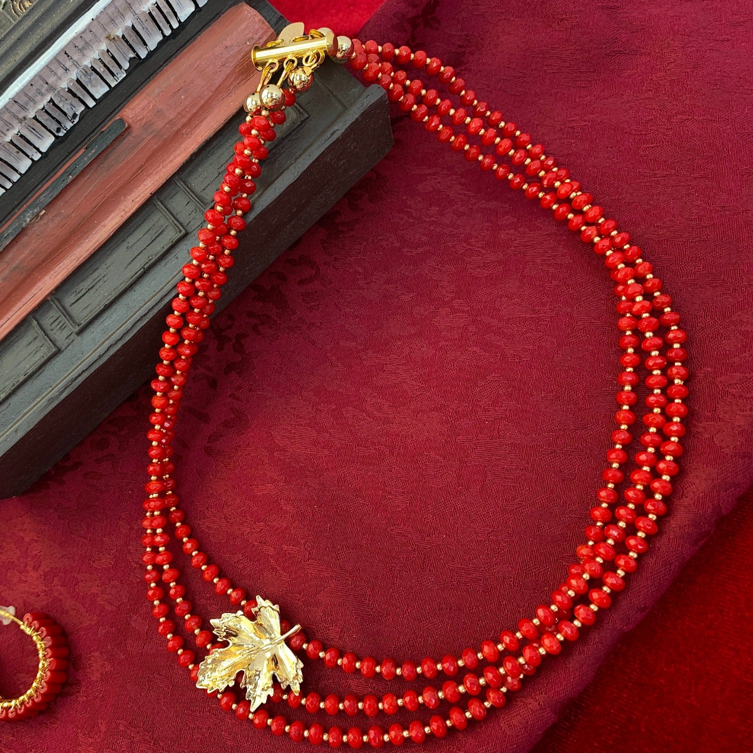 Red Coral With Maple Leaf Charm Multi Strands Statement Necklace