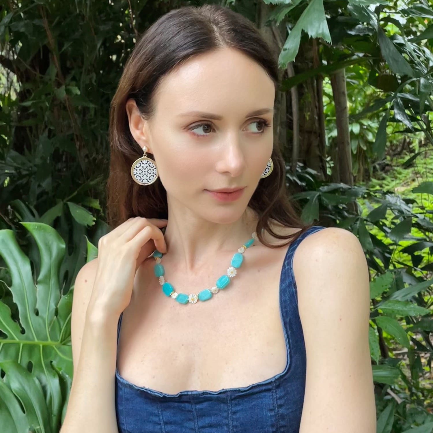 This Amazonite With Foral Shells Short Necklace by Farra is a beautiful and feminine accessory. This handmade necklace features amazonite with a shell and a floral design. It can be worn with a dress, knitwear, or denim, and it's sure to make your whole wardrobe pop.