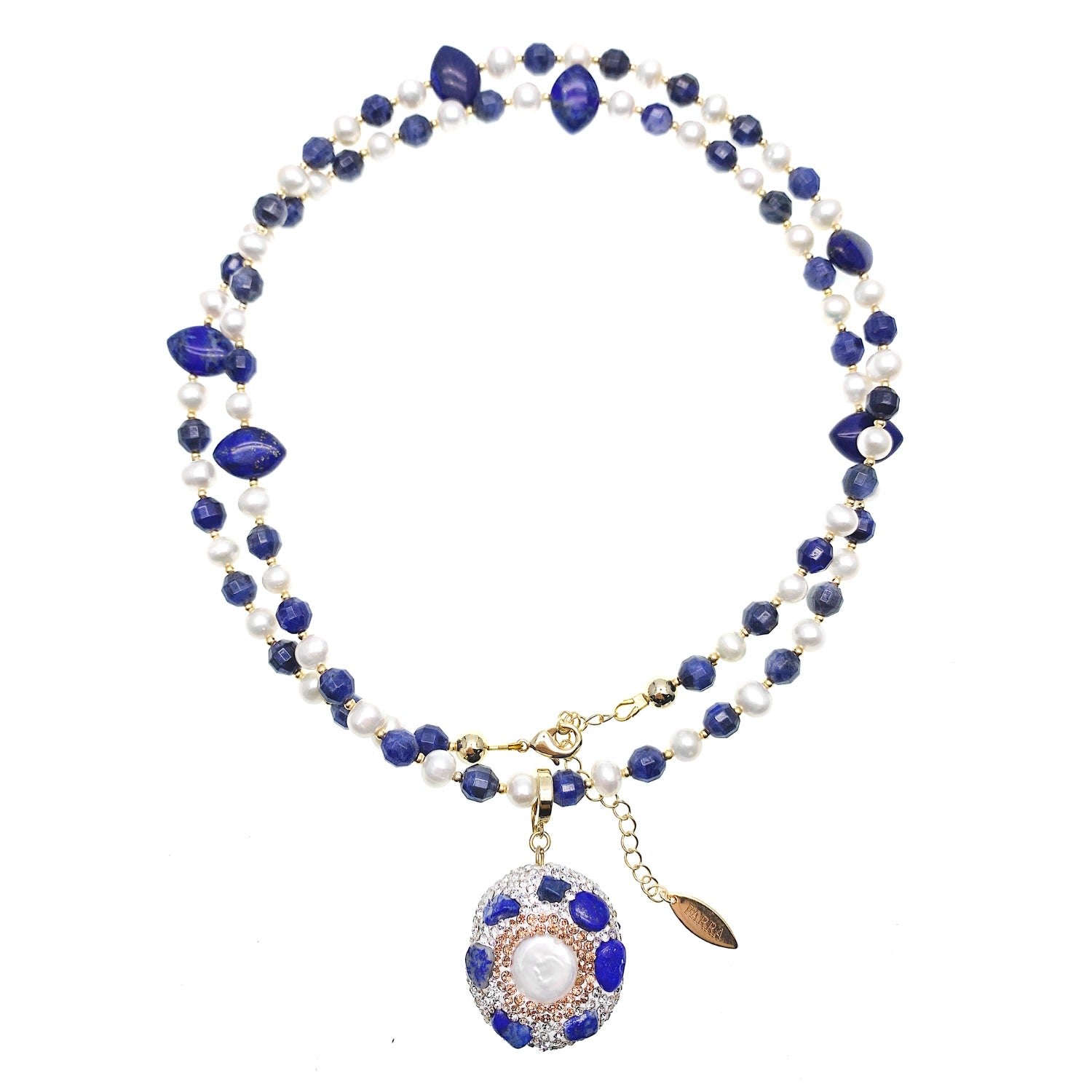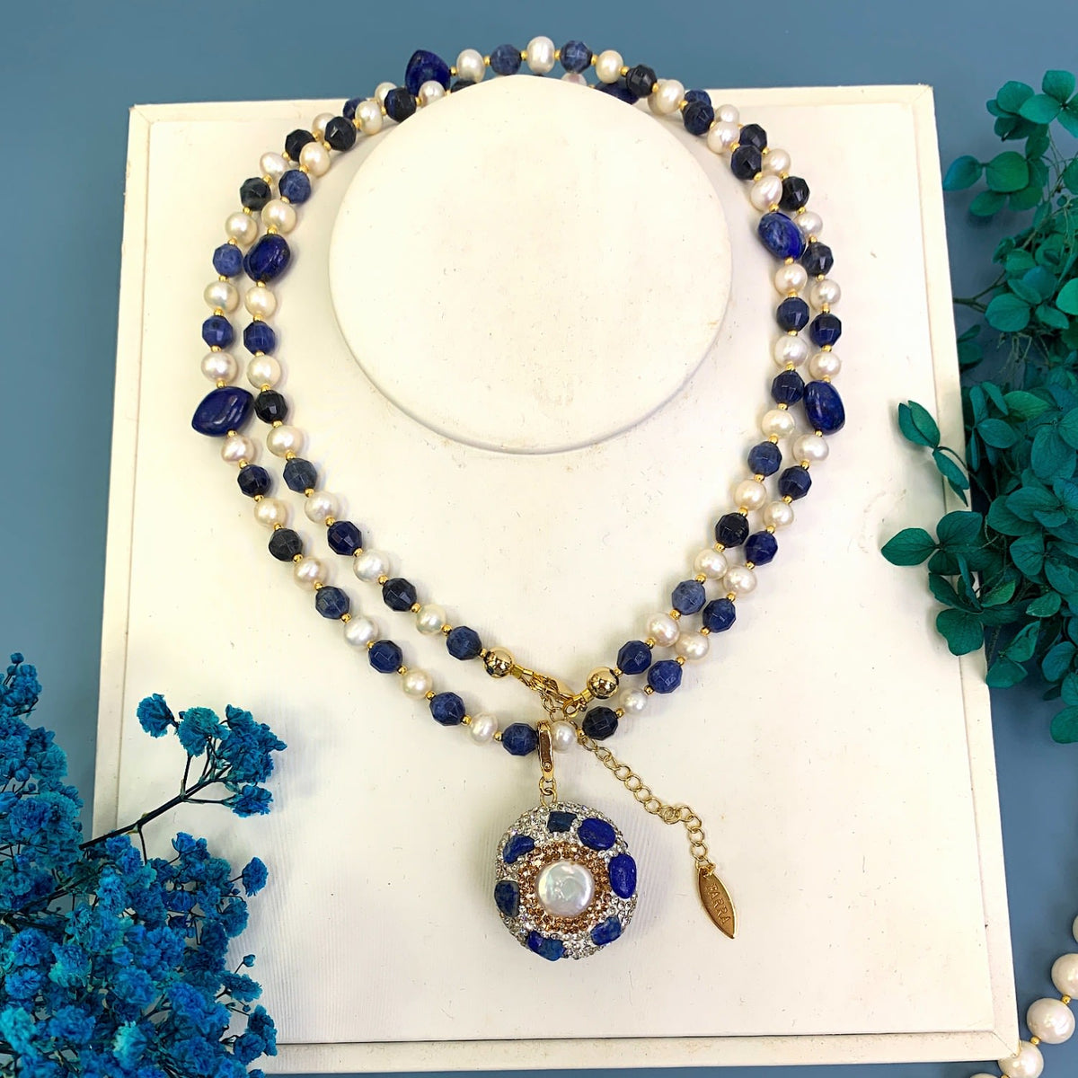 This handmade pearl necklace features a removable pendant, freshwater pearls with lapis, and Japan golden-plated brass findings.