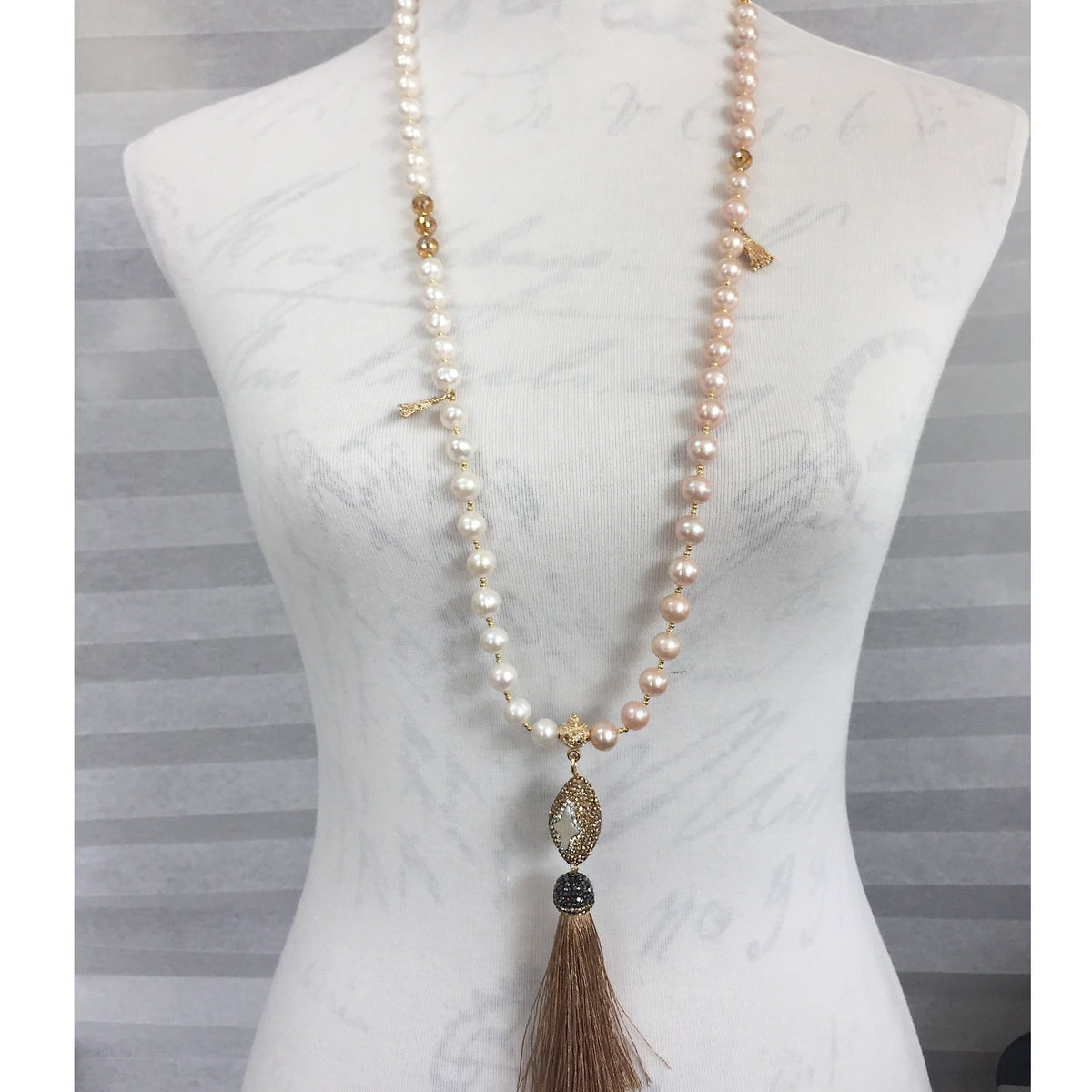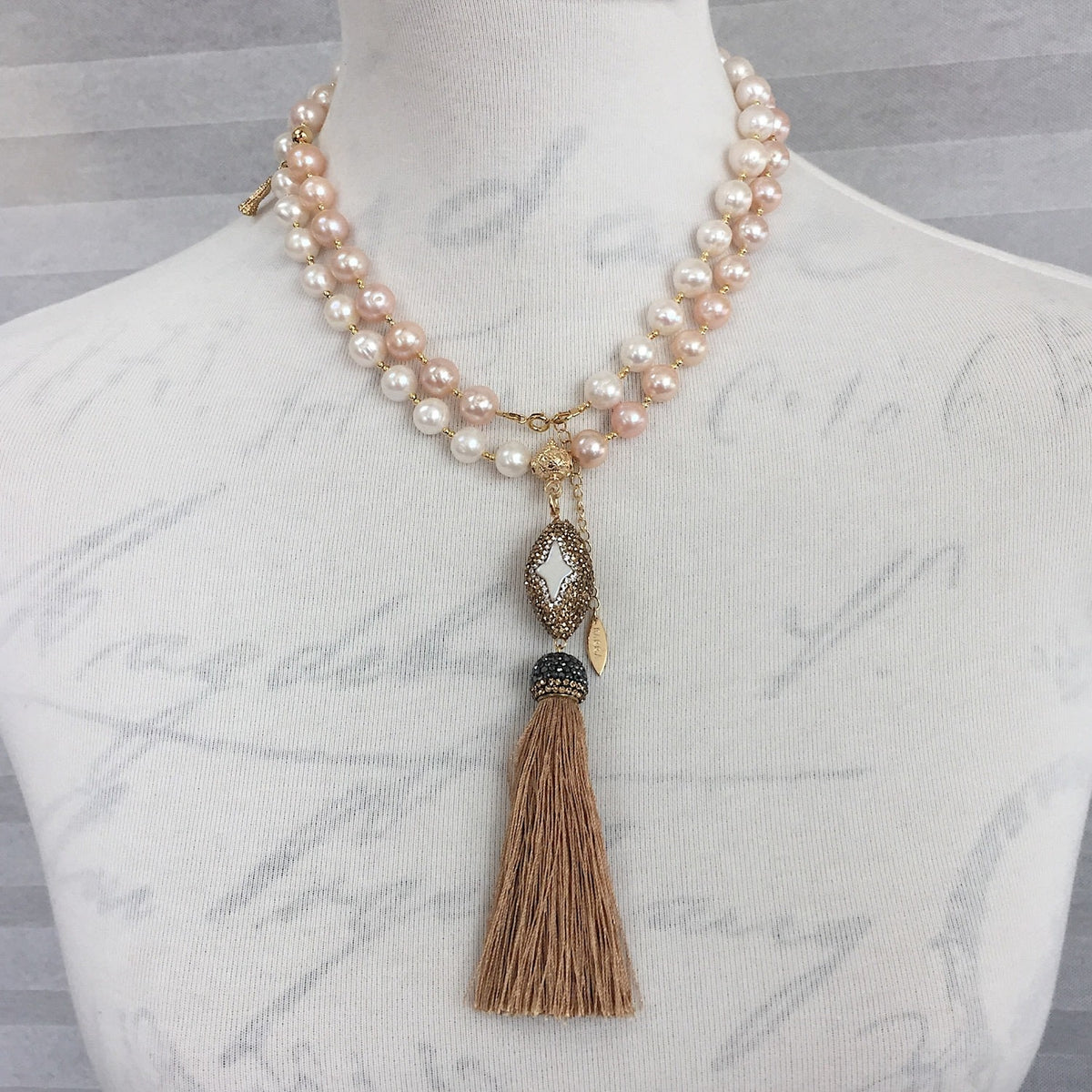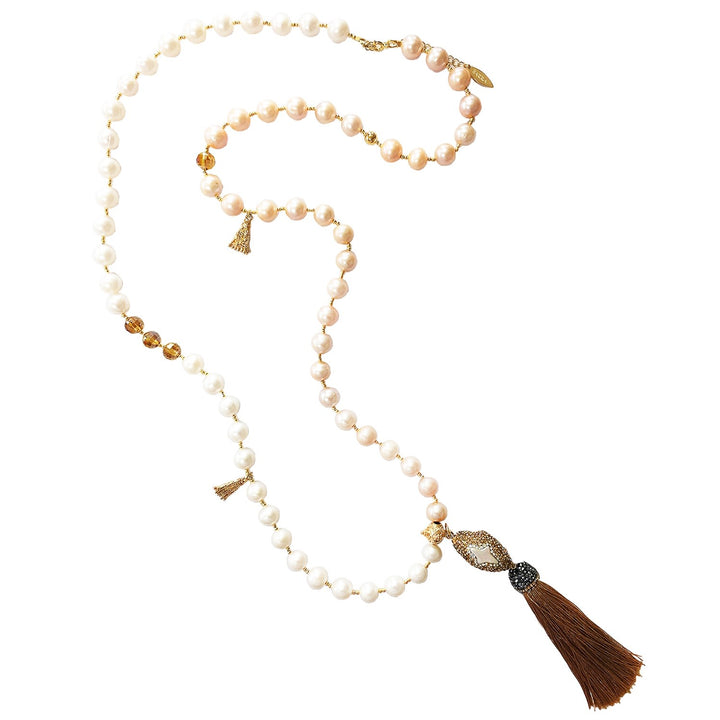 White & Orange Freswater Pearls With Rhinestone Tassel Multi-Way Necklace