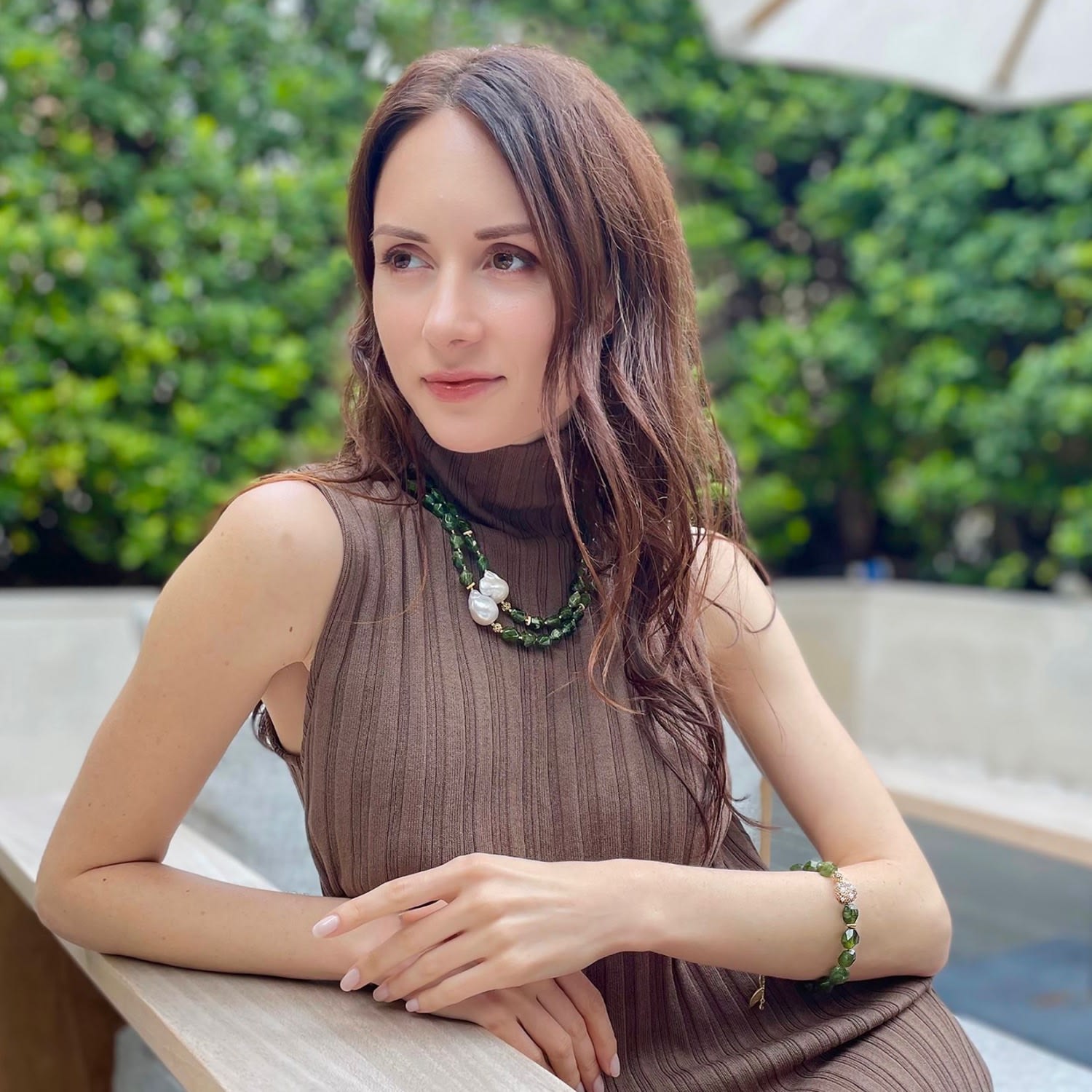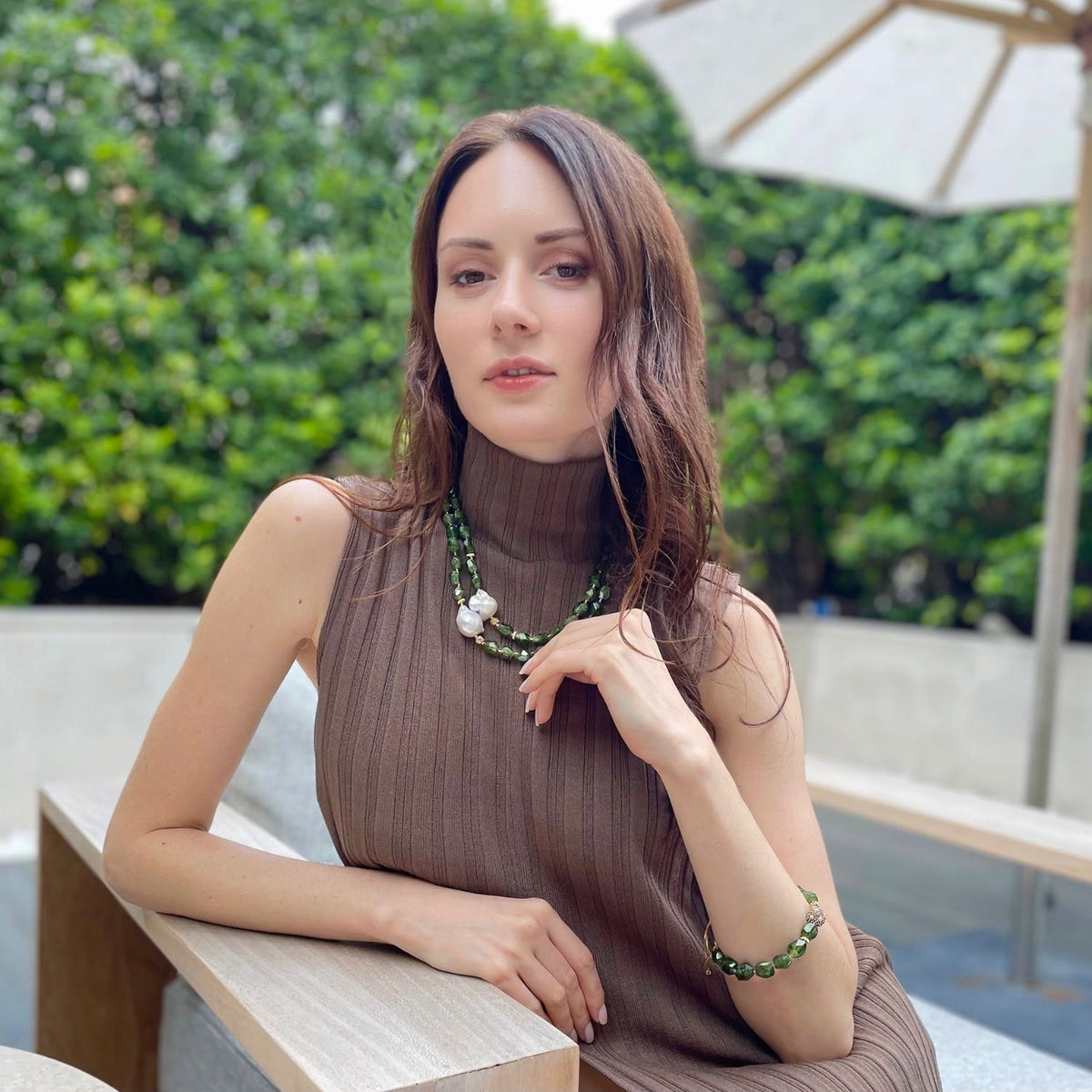 This Natural Diopside Double Strands With Baroque Double Strands Necklace by Farra is an elegant and unique accessory. This double-strand necklace is made of natural diopside with a baroque pearl. It is perfect for matching with a variety of outfits, from day to night.