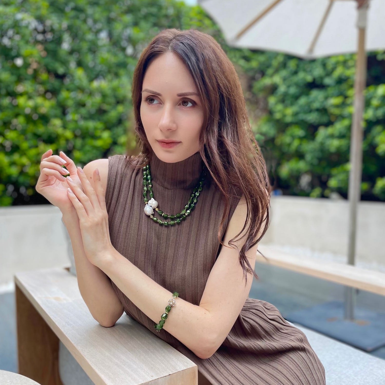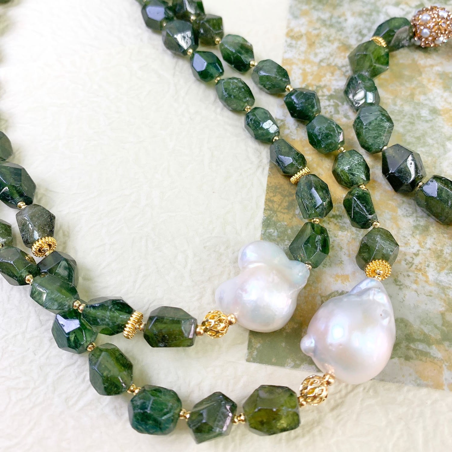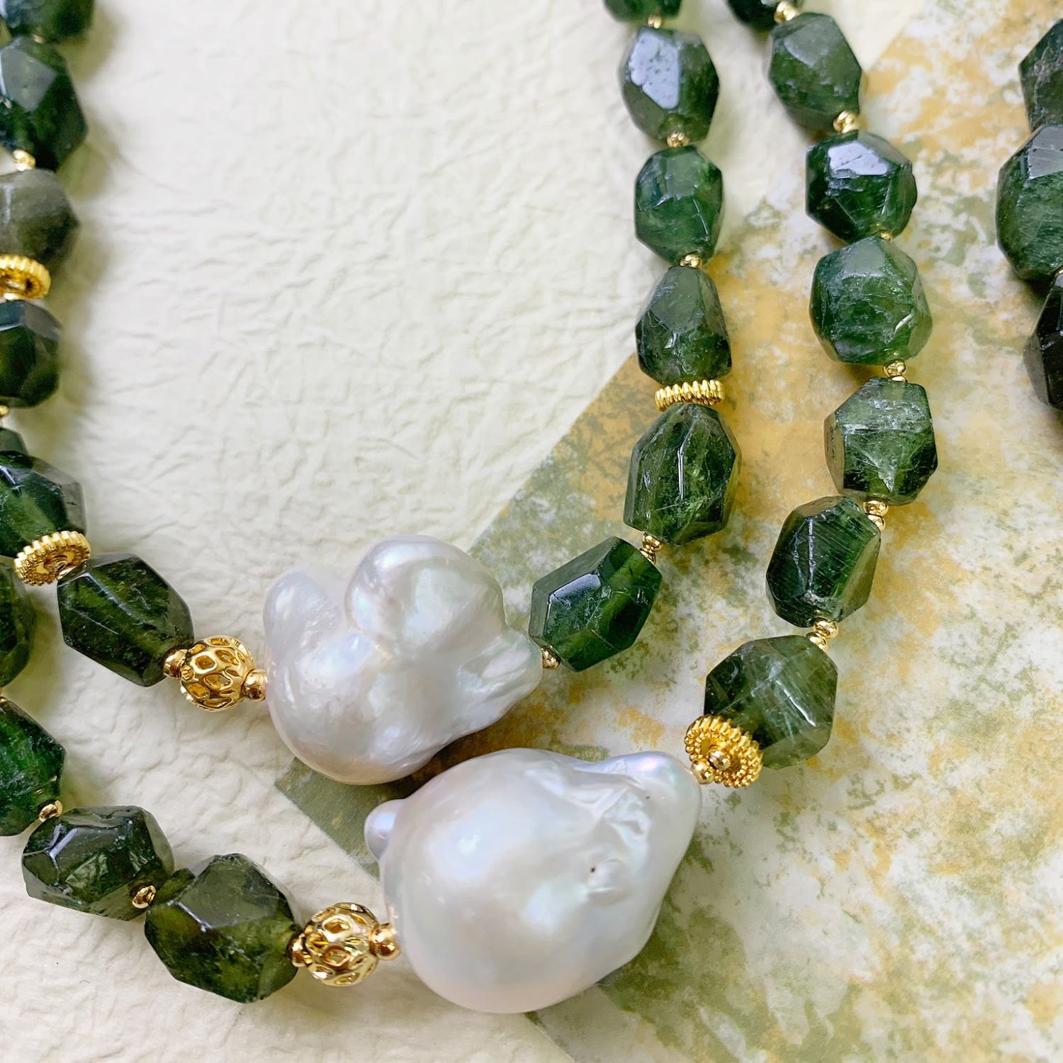 This handmade, double-strand necklace is made of natural diopside with a baroque pearl and Japanese golden-plated brass findings.