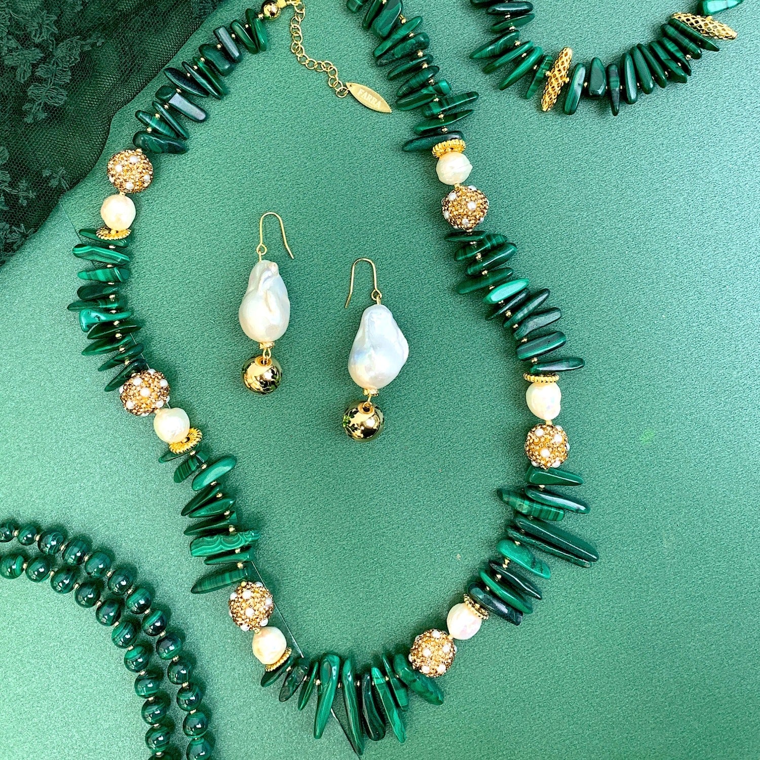 This handmade choker necklace is made of stick-shaped malachite, freshwater pearls with rhinestone-bordered pearls, and golden-plated brass findings.