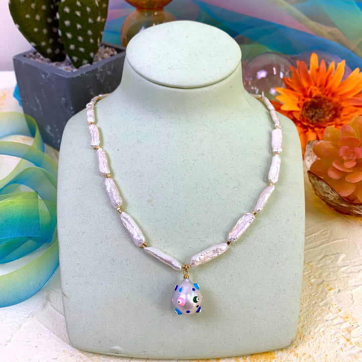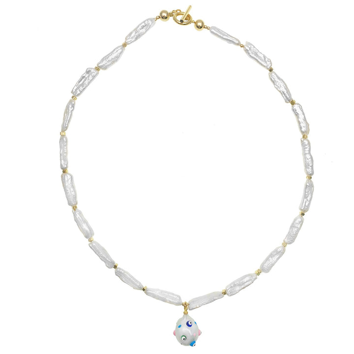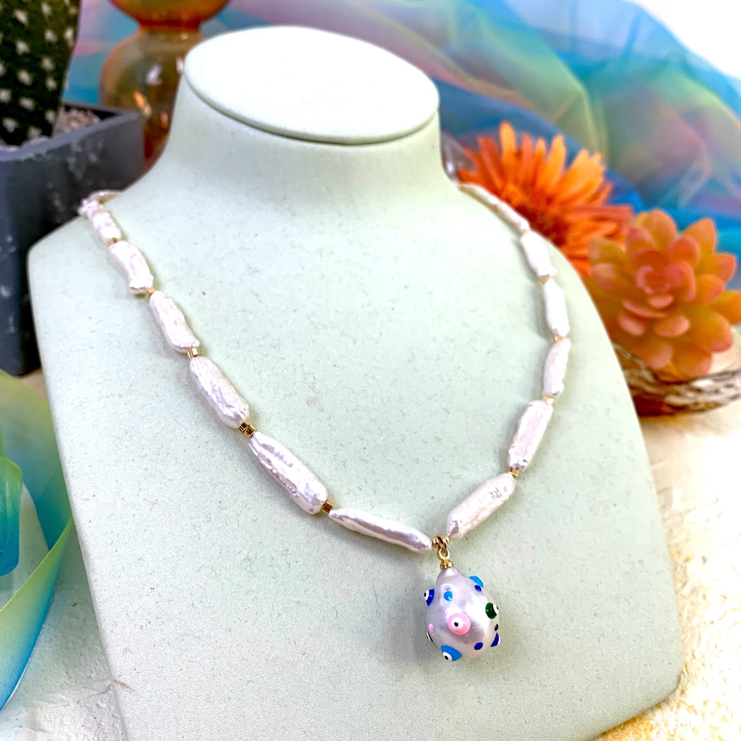 This handmade pearl necklace is made of freshwater pearls with a painted evil eye pendant and Japan golden-plated brass findings.