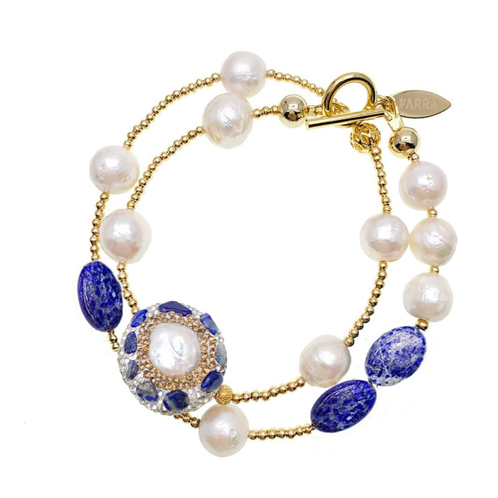 This Double Layers Pearls And Lapis Rhinestone Bracelet by Farra is an elegant and beautiful accessory. This bracelet features freshwater pearls and lapis with gold-plated brass findings. It can be worn as a double-wrapped bracelet, making it perfect for any occasion, from day to night.