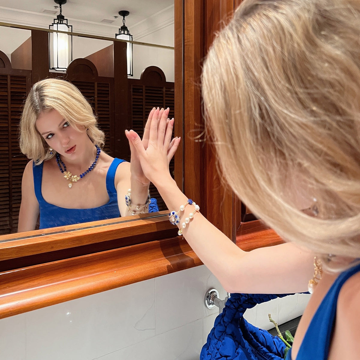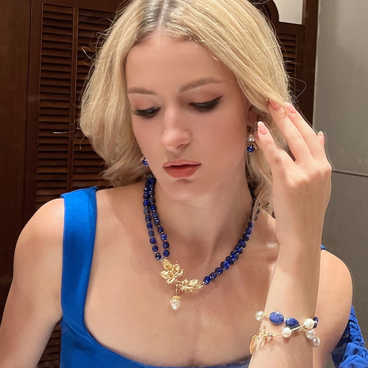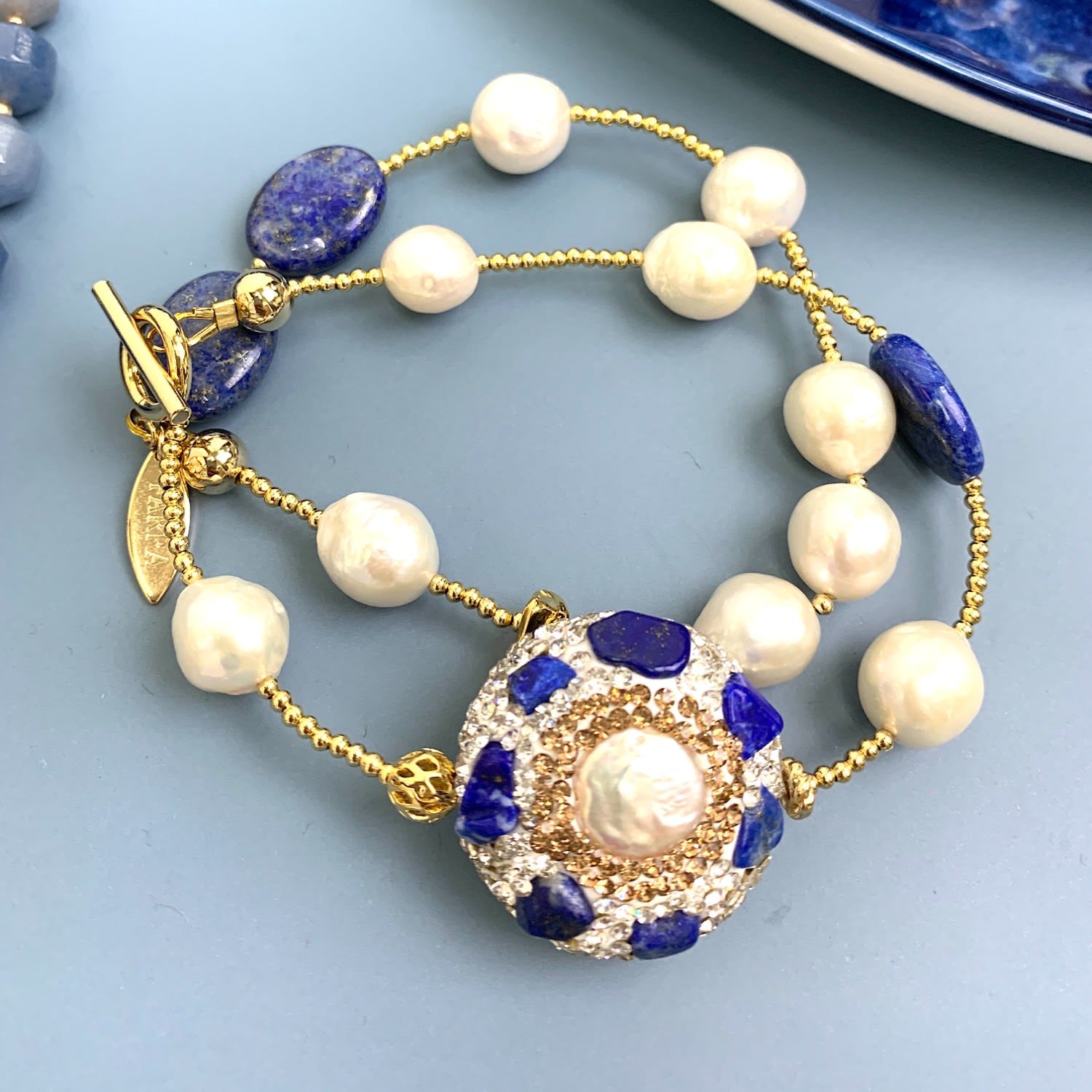 Double Layers Pearls And Lapis Rhinestone Bracelet