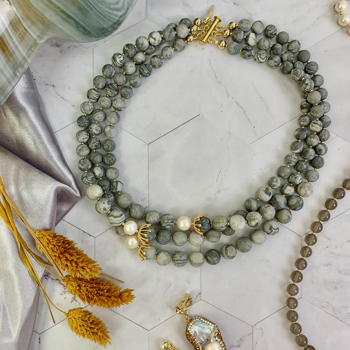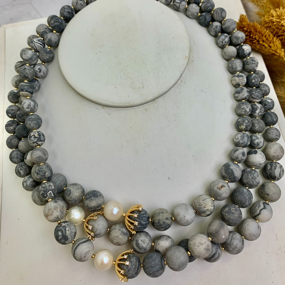 Classic Multi-Layers Gray Agate With White Pearls Statement Necklace
