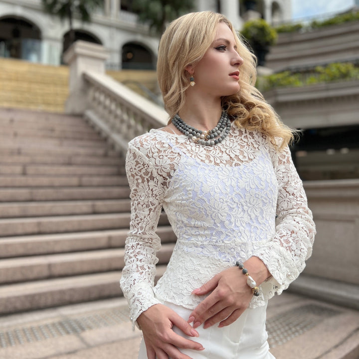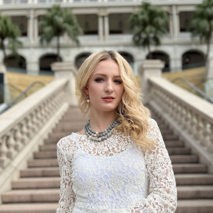 This Classic Multi-Layers Gray Agate With White Pearls Statement Necklace by Farra is a beautiful and unique accessory. This handmade, multi-layered necklace features matte gray agate and freshwater pearls. It's perfect for wearing with a tube top, blouse, or midi dress for any event.